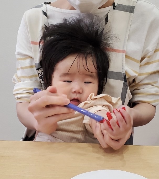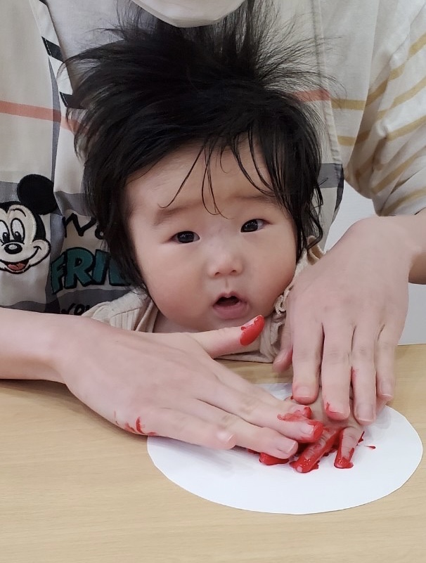 塗っている途中は、手をグーっと握っていましたが、画用紙に手形をとる際は、保育者と一緒にしっかりと広げることができました✋🏻