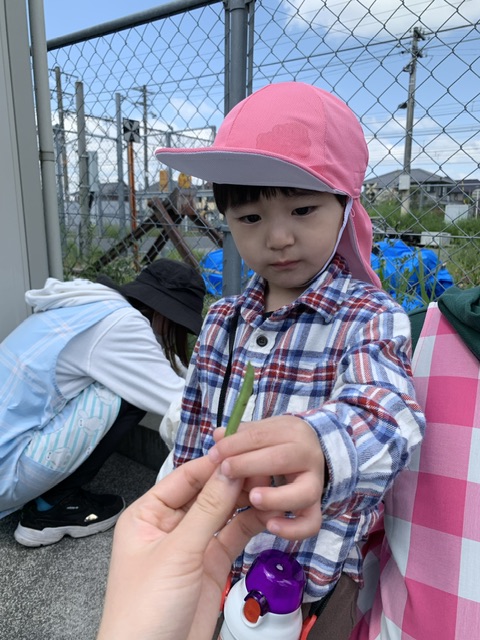 先週に、そら豆やグリンピースの制作遊びをしていたこともあり、カラスノエンドウに関心を持った子どもたち😊保育者が、カラスノエンドウを見つけて皮をむいてみると、中から出てきたお豆に興味津々に触っていました。