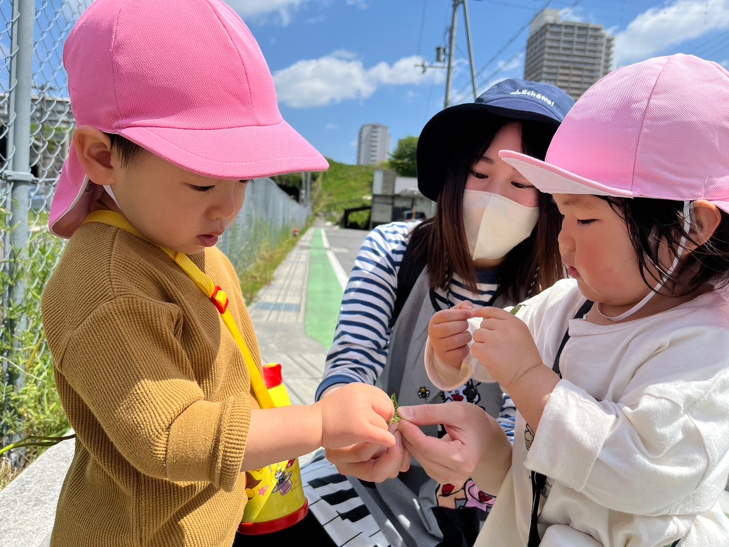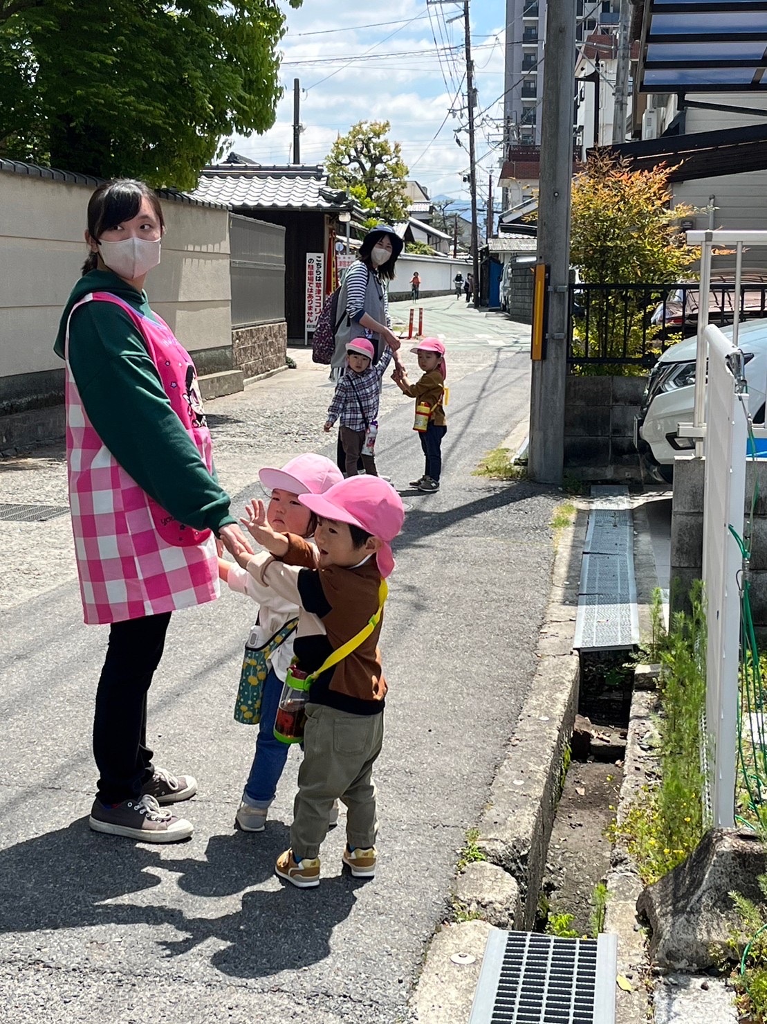 2歳児クラスになってからは、お友だちと手をつないで散歩にいきます。
