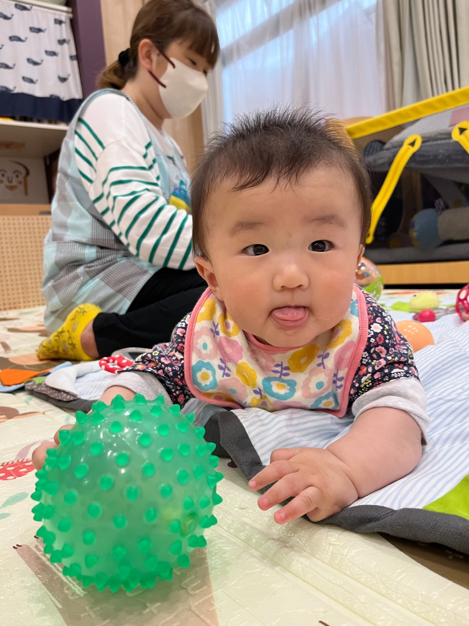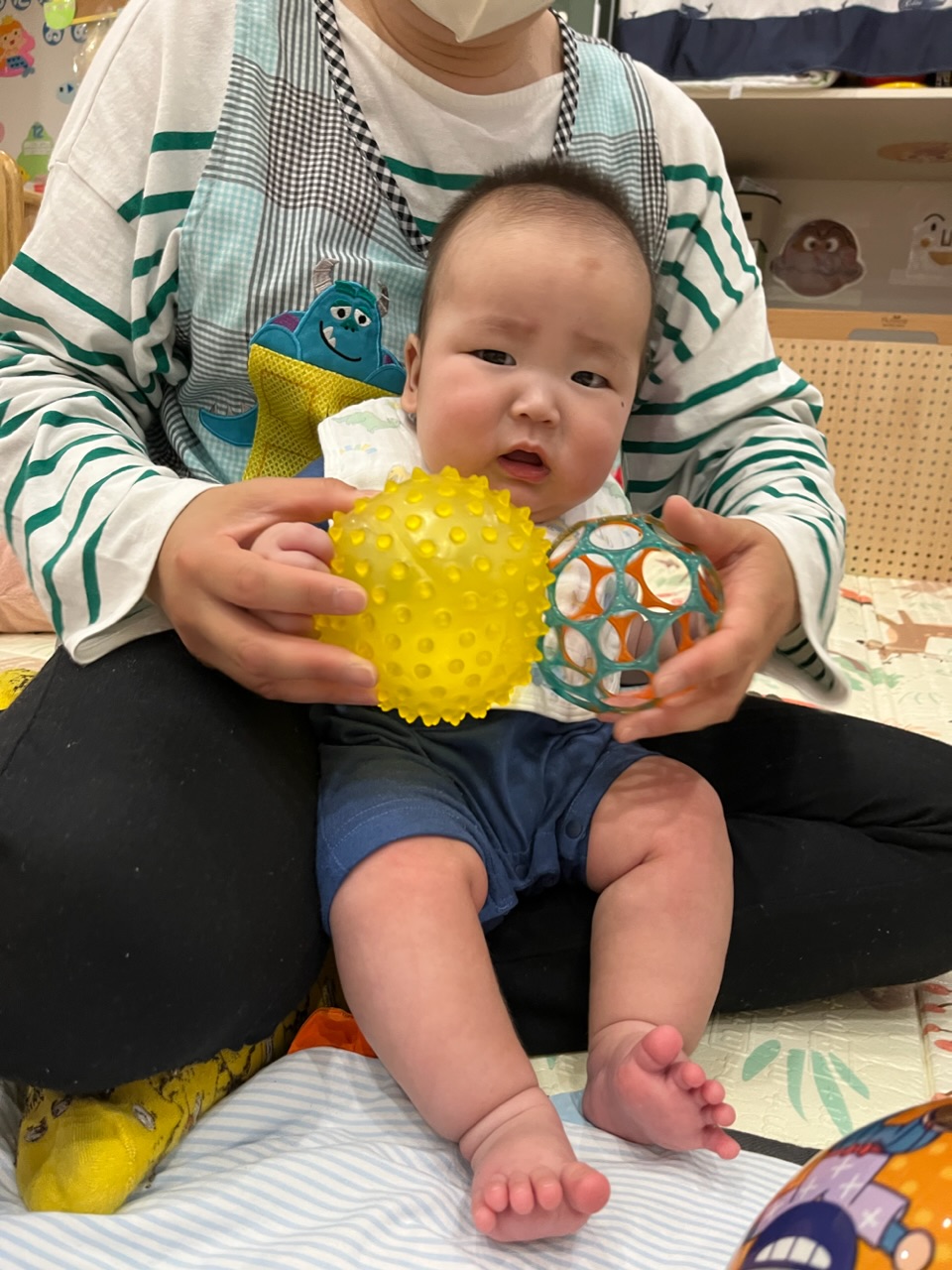 違う感触のボールを両手に持って、保育者とリラックスしながら遊びました☺️