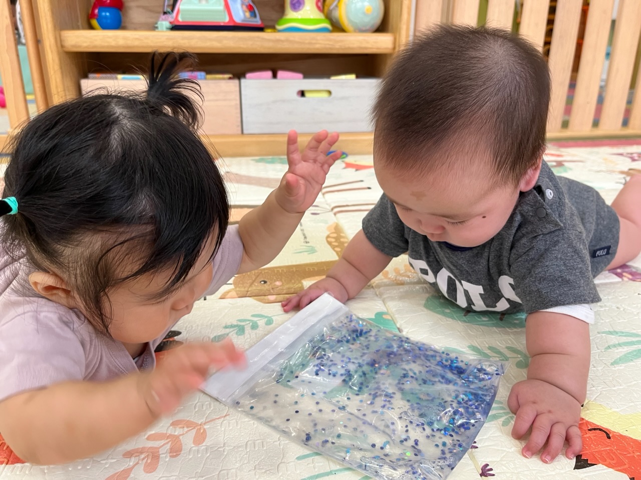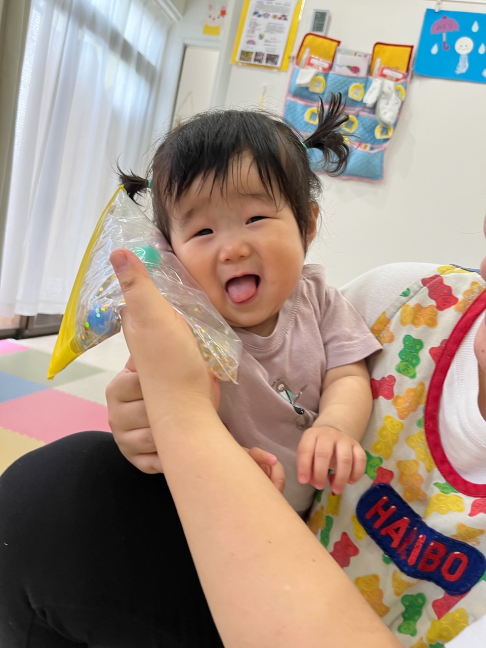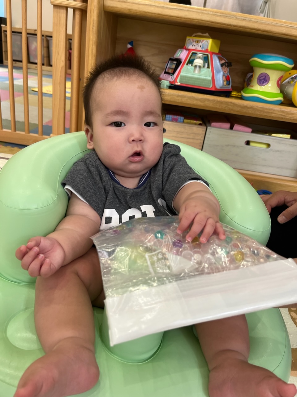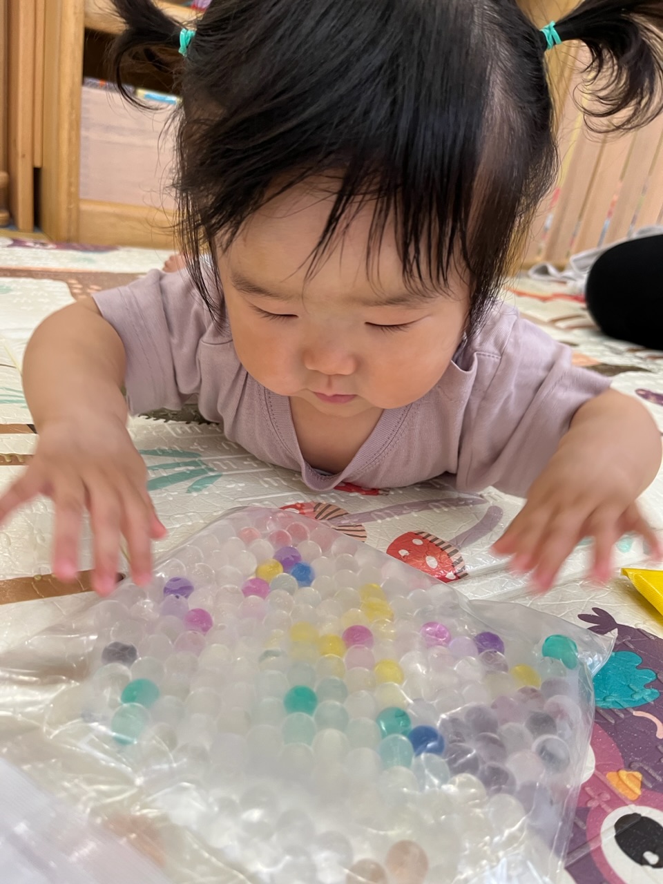 プラントビーズの入ったセンサリーバッグにも触れ、粒々とした感触に驚く子ども達👀!