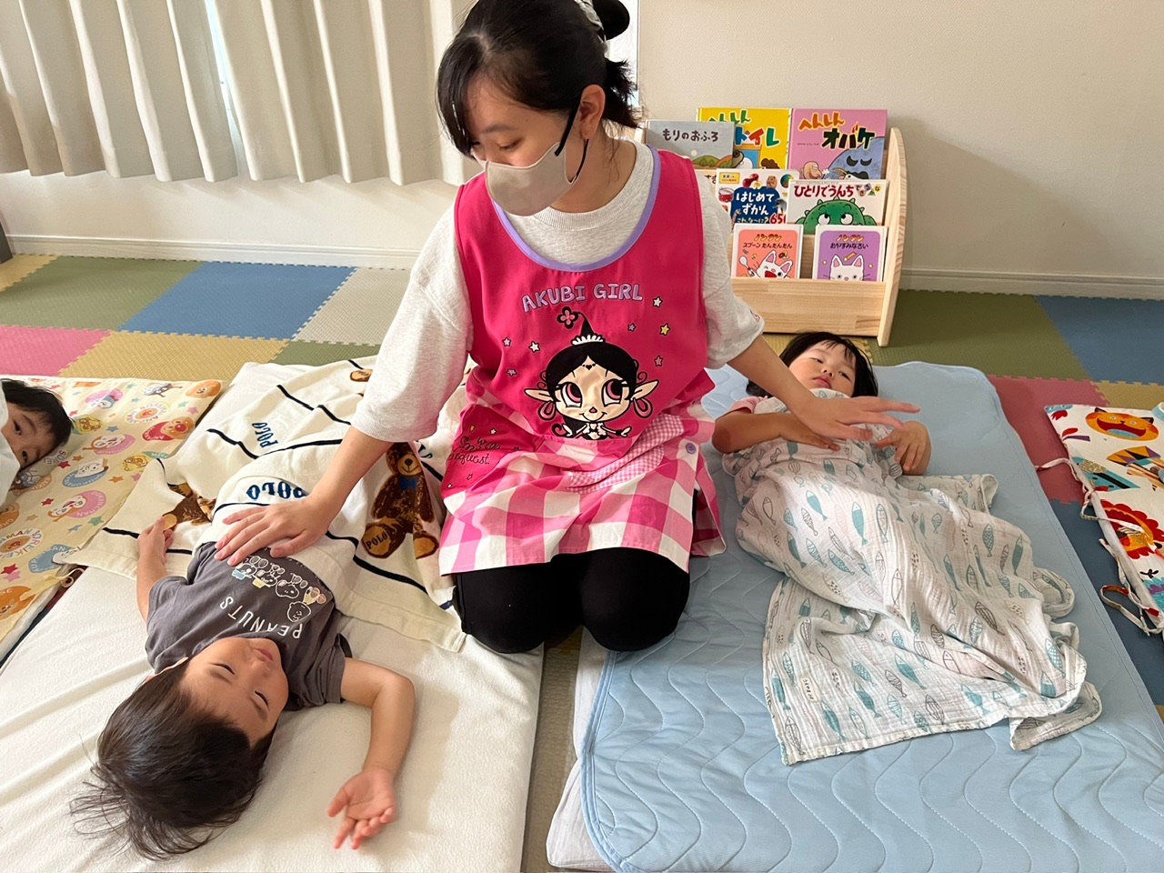 15時前に、子どもたちを起こし、着替えを手伝ったり、子どもたちの検温を計ります。