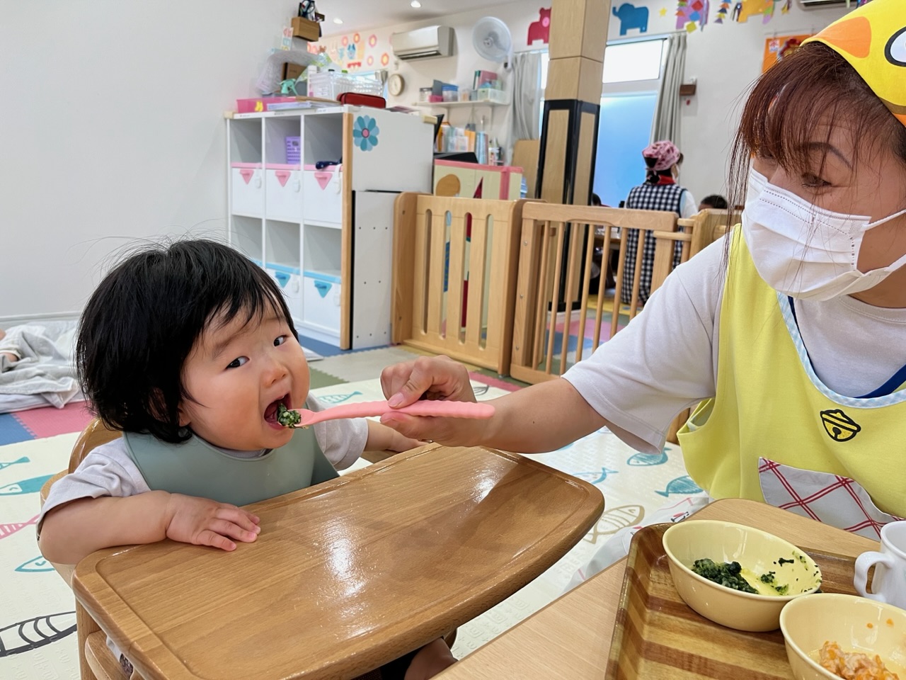 「いただきます」と手を合わせてご挨拶をして、保育者にご飯を食べさせてもらいます💓