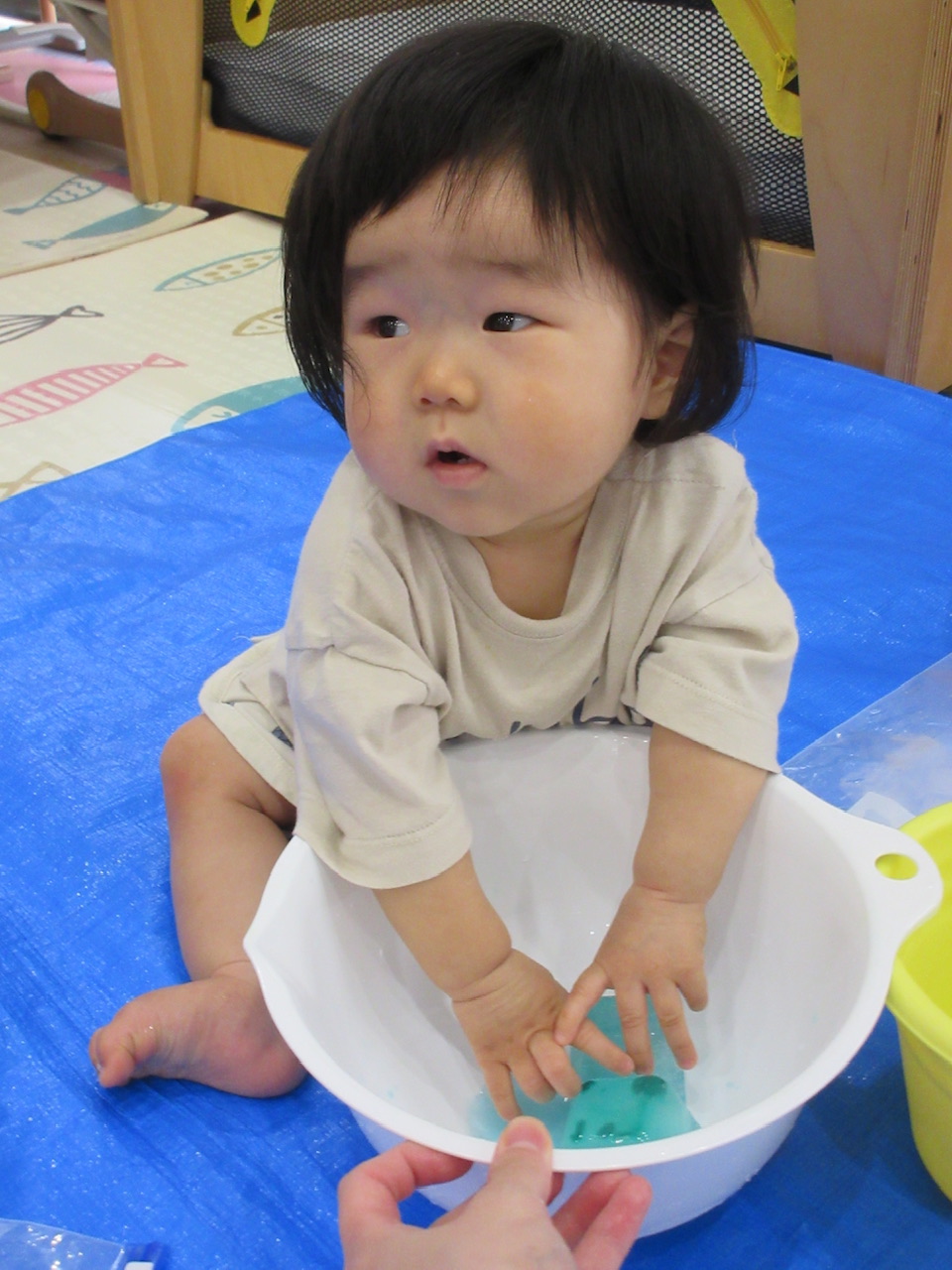 バケツの中に入った氷にも興味津々で、自ら手を入れてかき混ぜて遊んでいました🎵