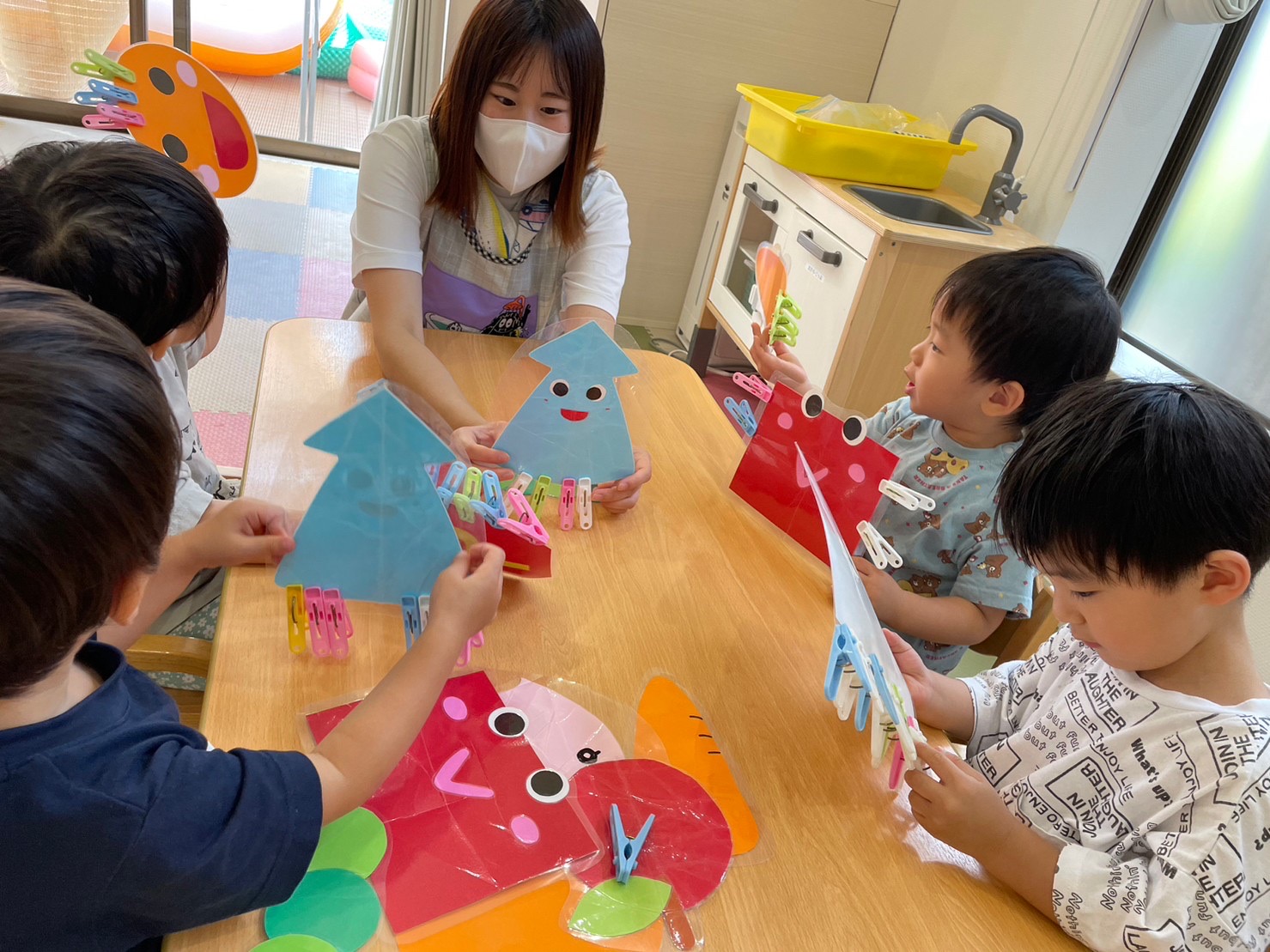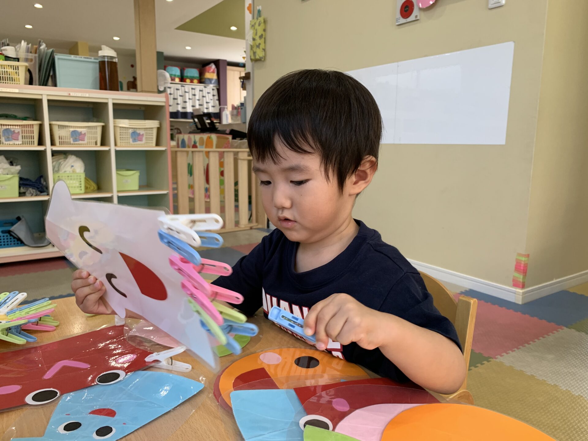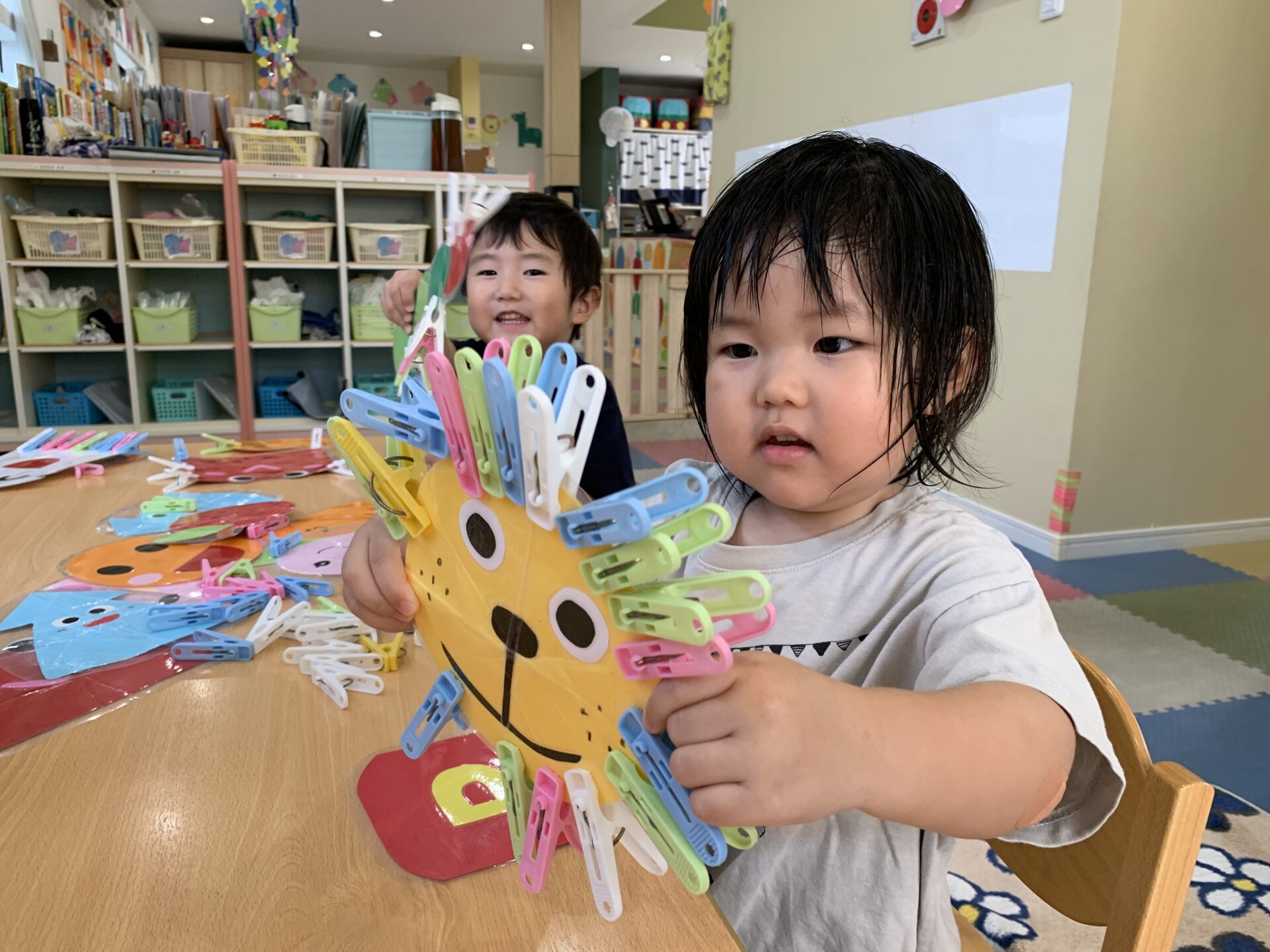最初は、イカやライオンなど様々な台紙がある中から好きなものを選び、洗濯バサミを足やたてがみに見立てて挟んでいく子どもたち😊