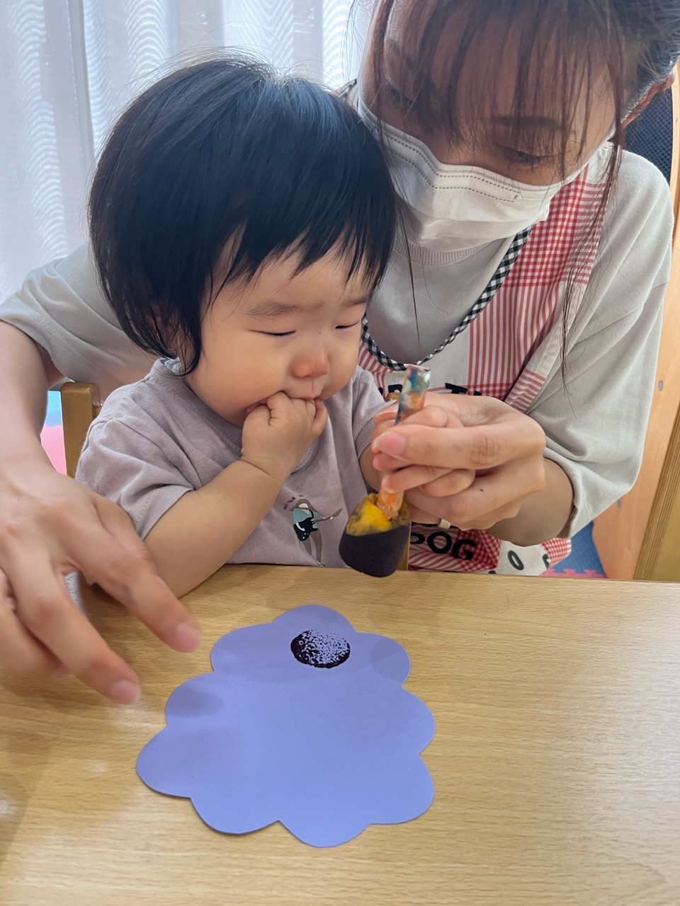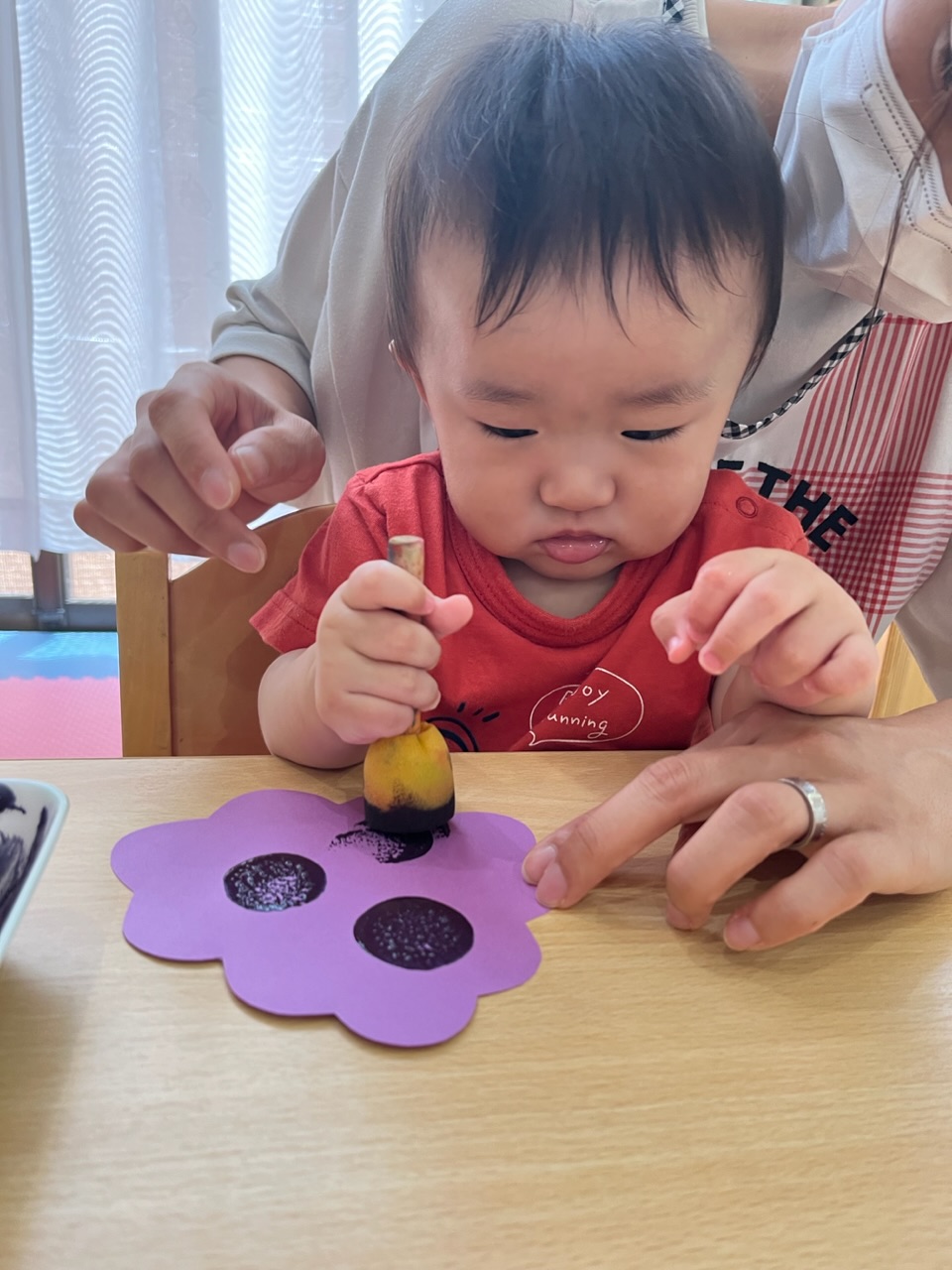 保育者と一緒に握りながら、ゆっくりタンポを押してみます♪
