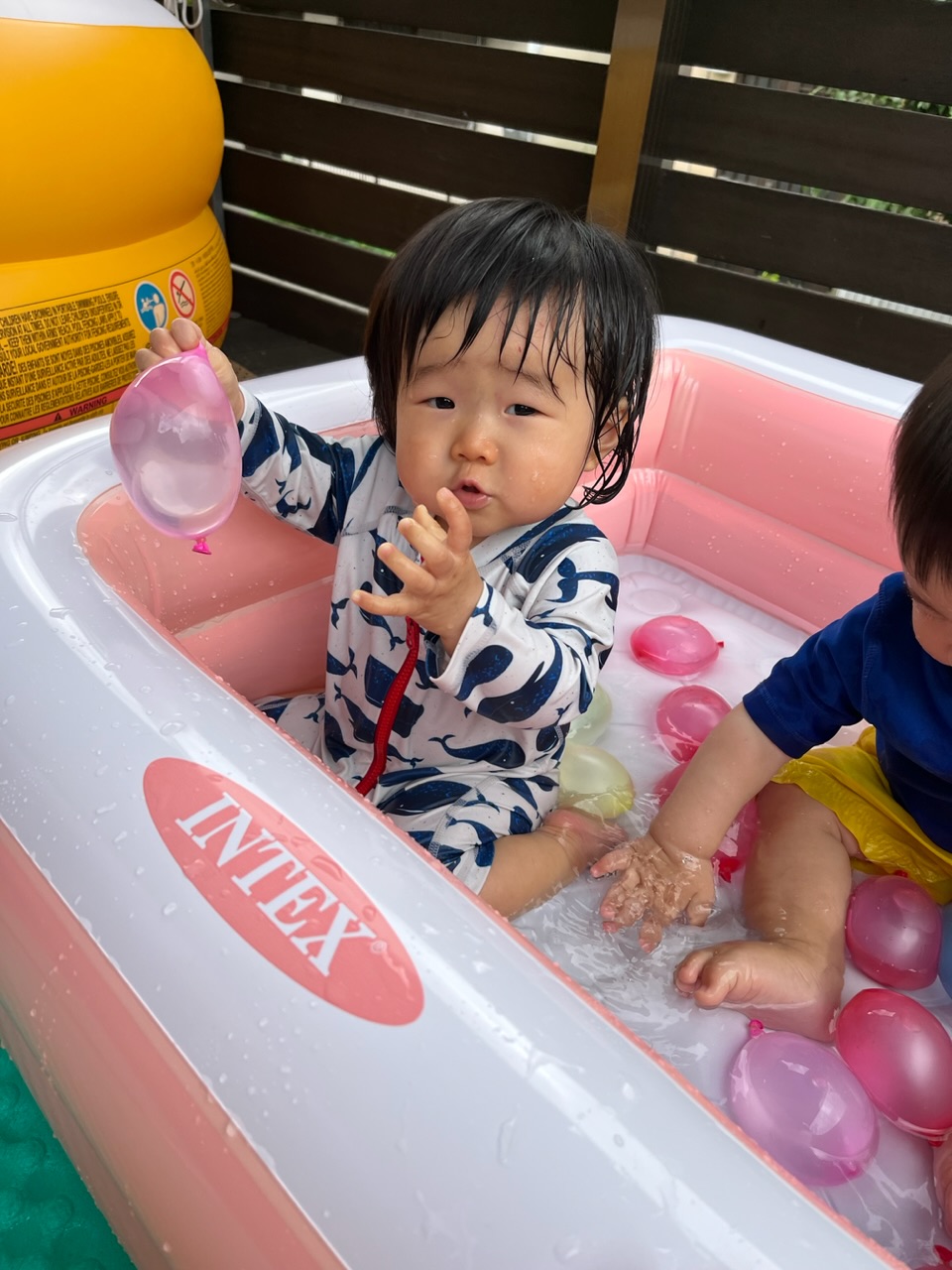 「いろいな色の風船がいっぱいだよー!」と目を輝かせながら、近くにある水風船を手に取り、プニプニとした感触を楽しみました🎈