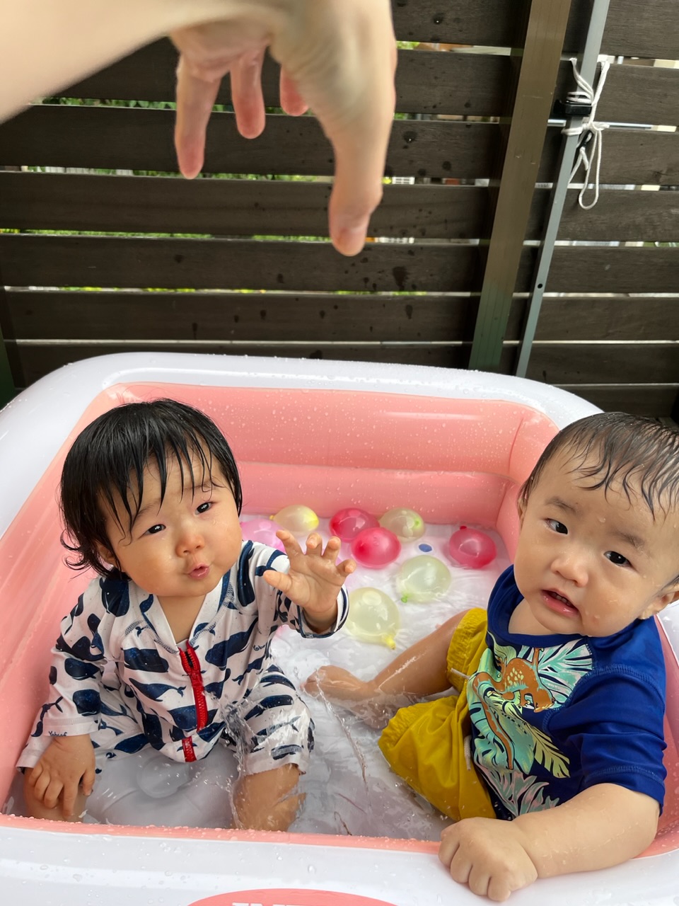手で掴もうとしたり、少し驚いたりしながらも、バッチャーン!と勢いよく落ちる水風船に大盛り上がりの子どもたちでした😆💕