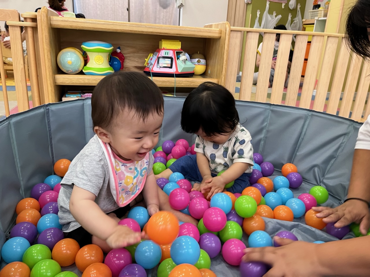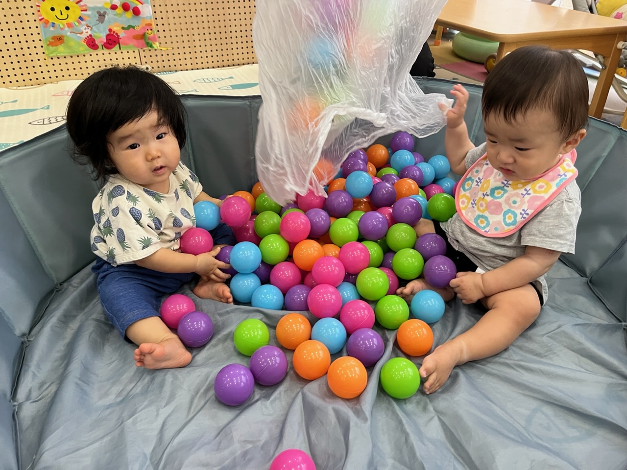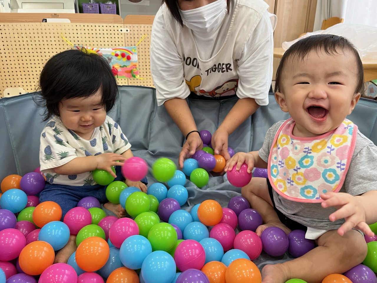 「ボールいっぱいで楽しいね〜!」と保育者が声をかけると、満面の笑みを見せてくれました🥰