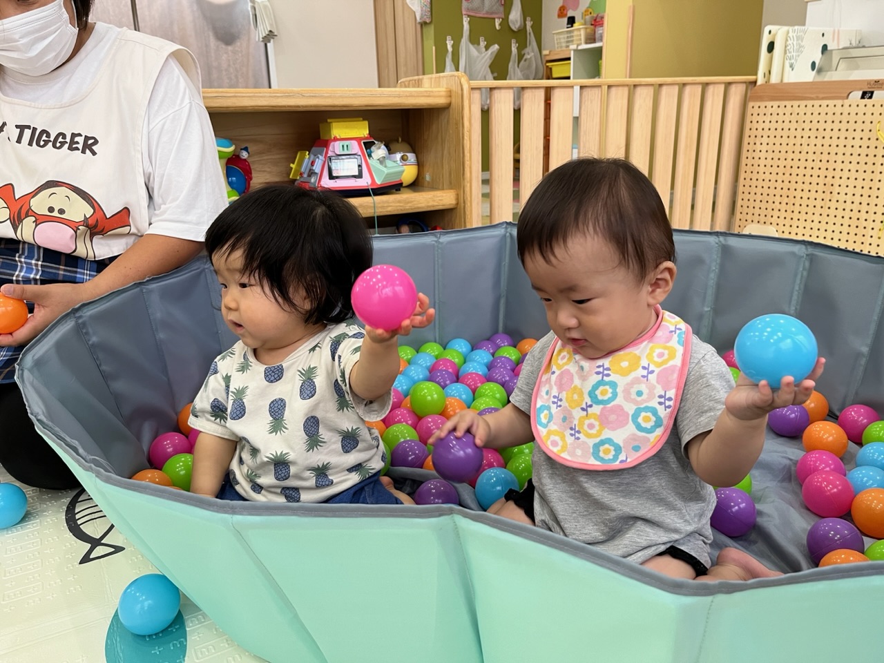 保育者がボールをガシャガシャとかき回していると、真似して触り始める子どもたち💙