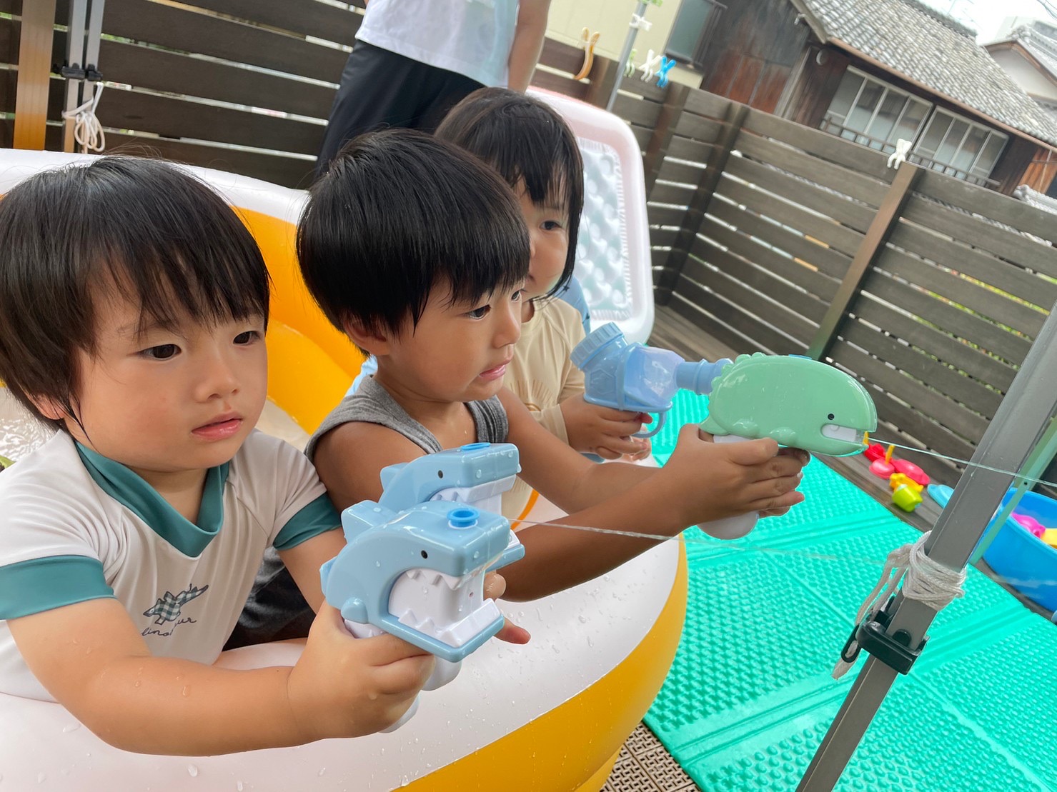 そして、子どもたちが塗り絵をした魚たちを的にして、水鉄砲で水をかけて的当てしました😊