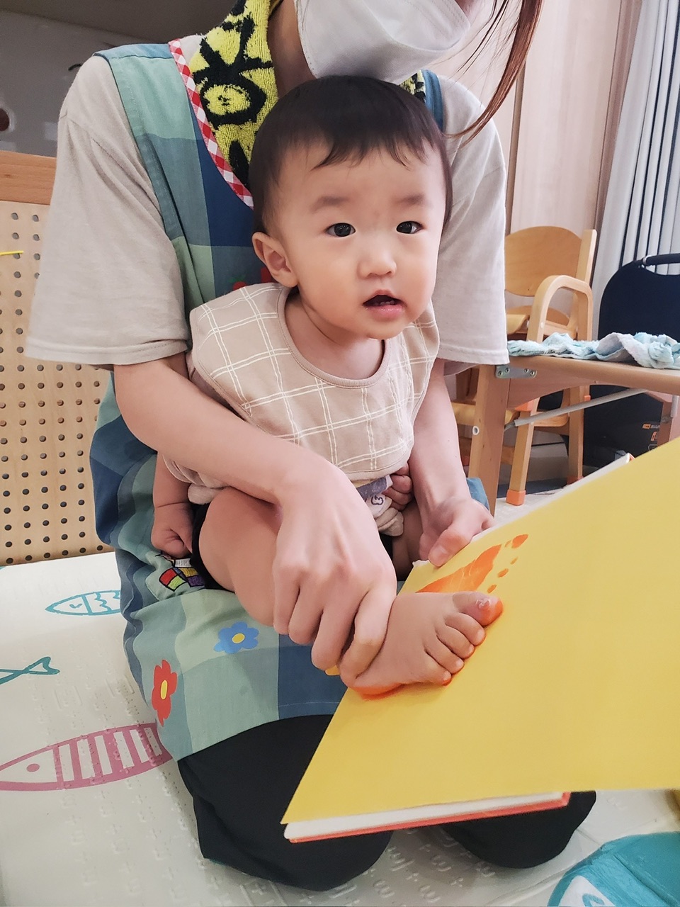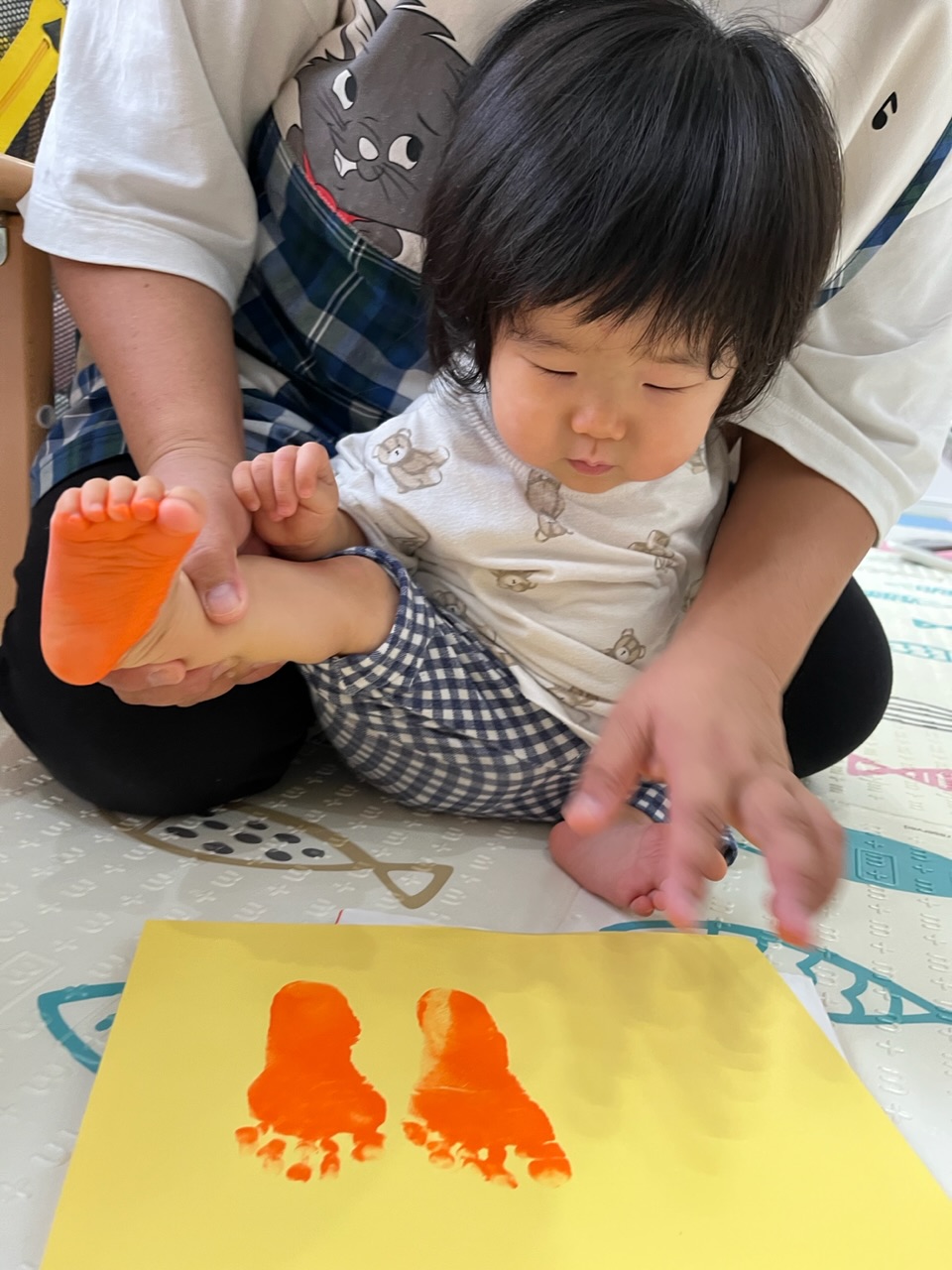 ハロウィンのかぼちゃを制作する為、オレンジ色のスタンプ台で足型をとります🎃