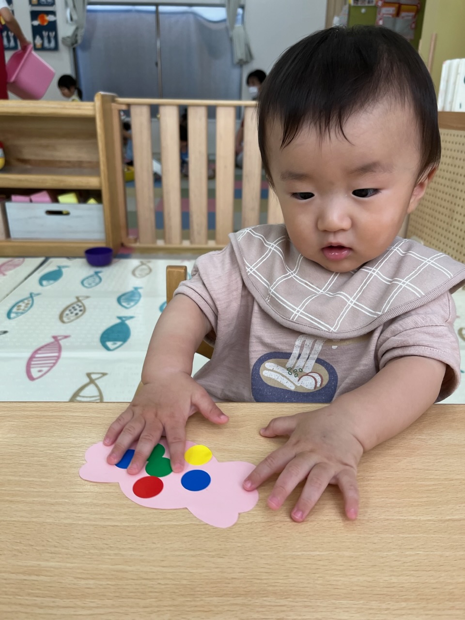 翌日は、高月齢児のみキャンディーの台紙にシールを貼って、制作をしました。