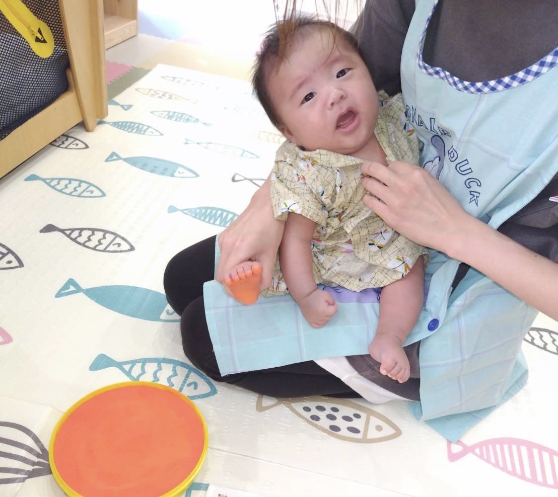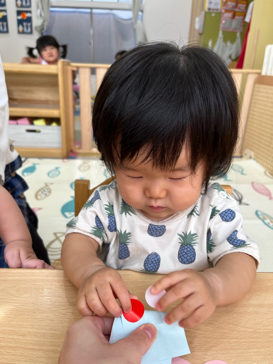 大きな丸シールに興味を示しながら、保育者に折り曲げてもらった台紙から、シールを一生懸命に剥がします✨