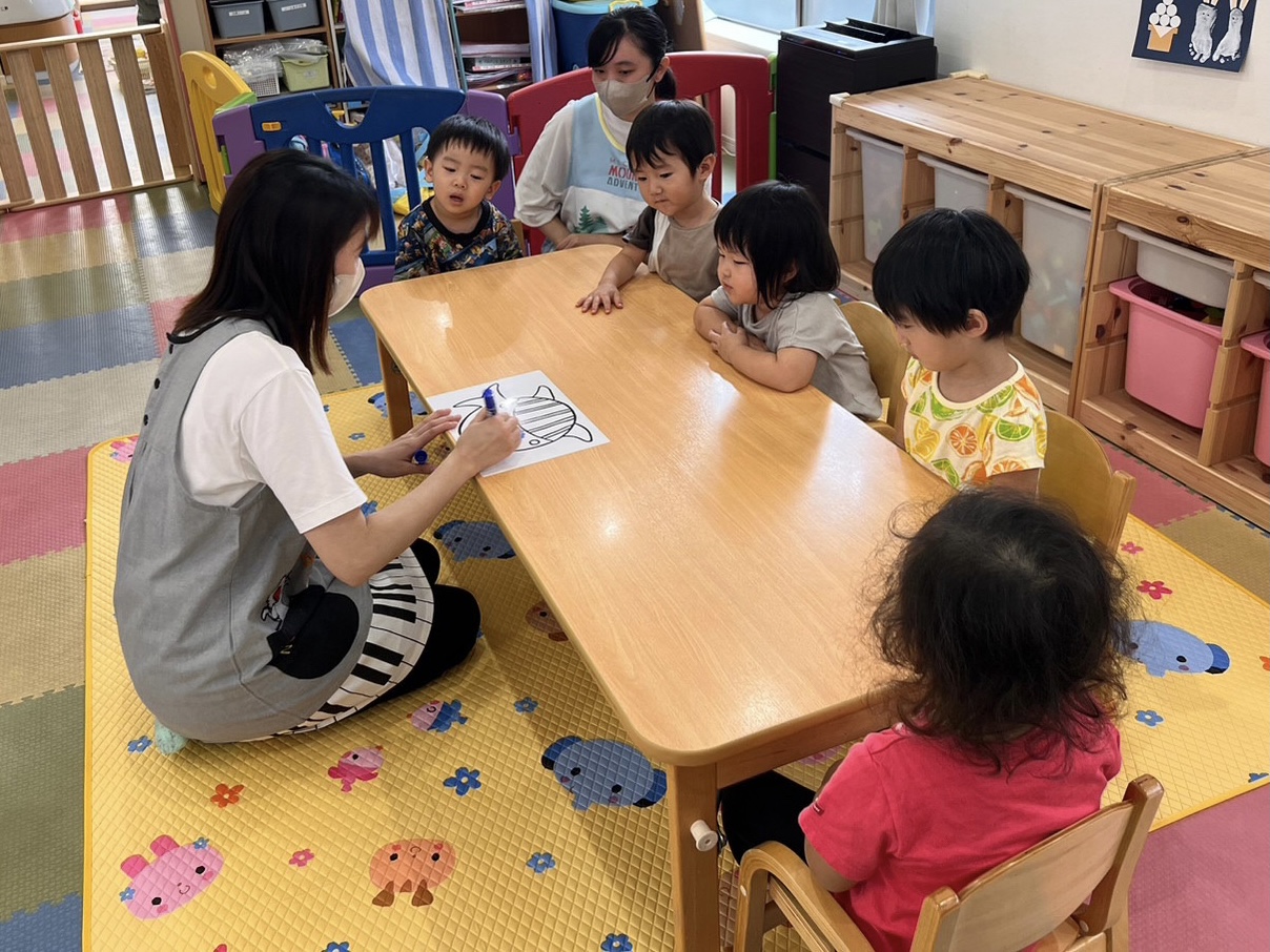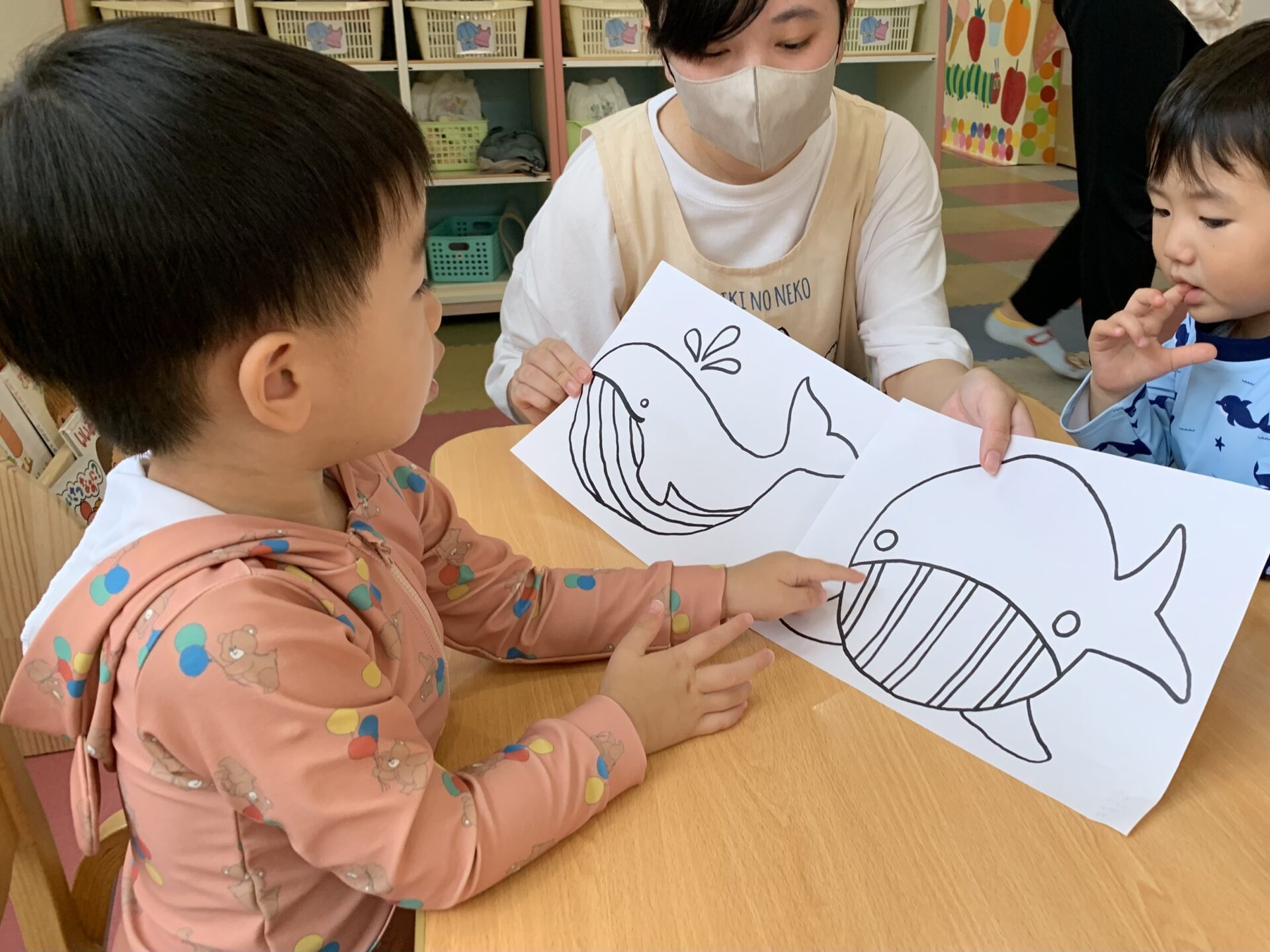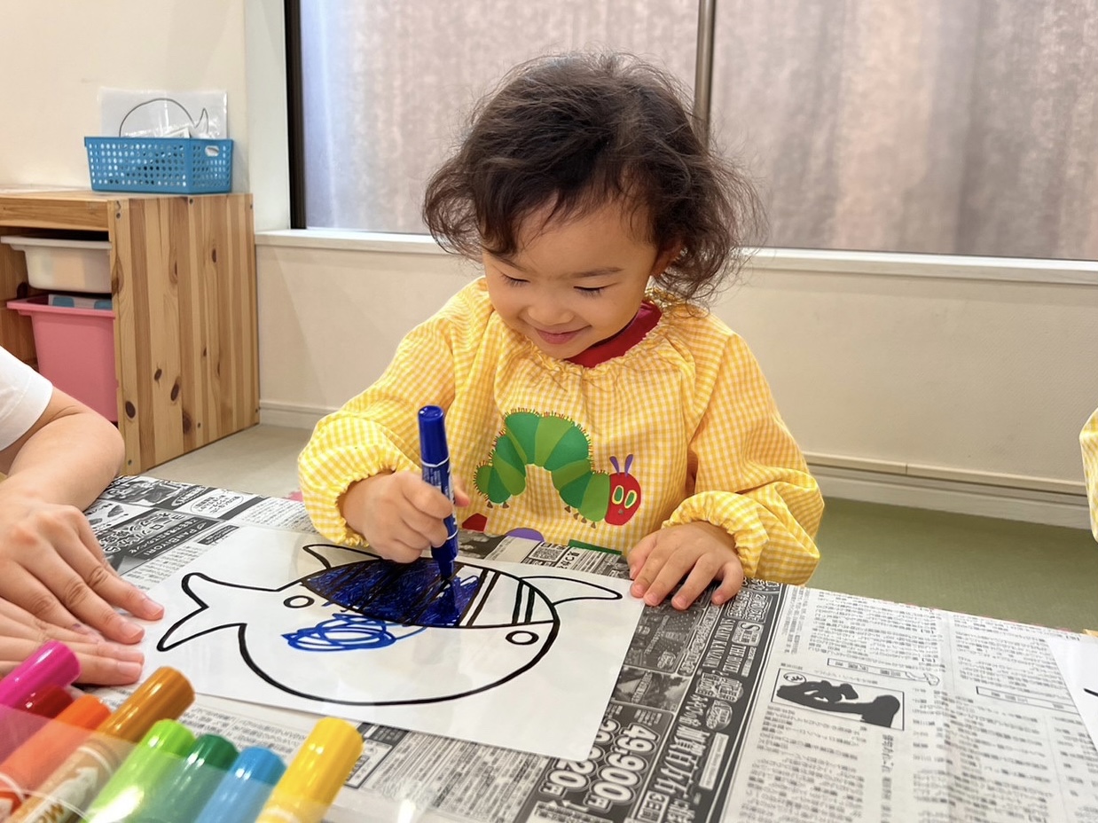 くじらの目やヒゲなど、集中して塗りつぶしたり、保育者が描いたくじらの線をなぞるように描くお友だちもいました👀✨