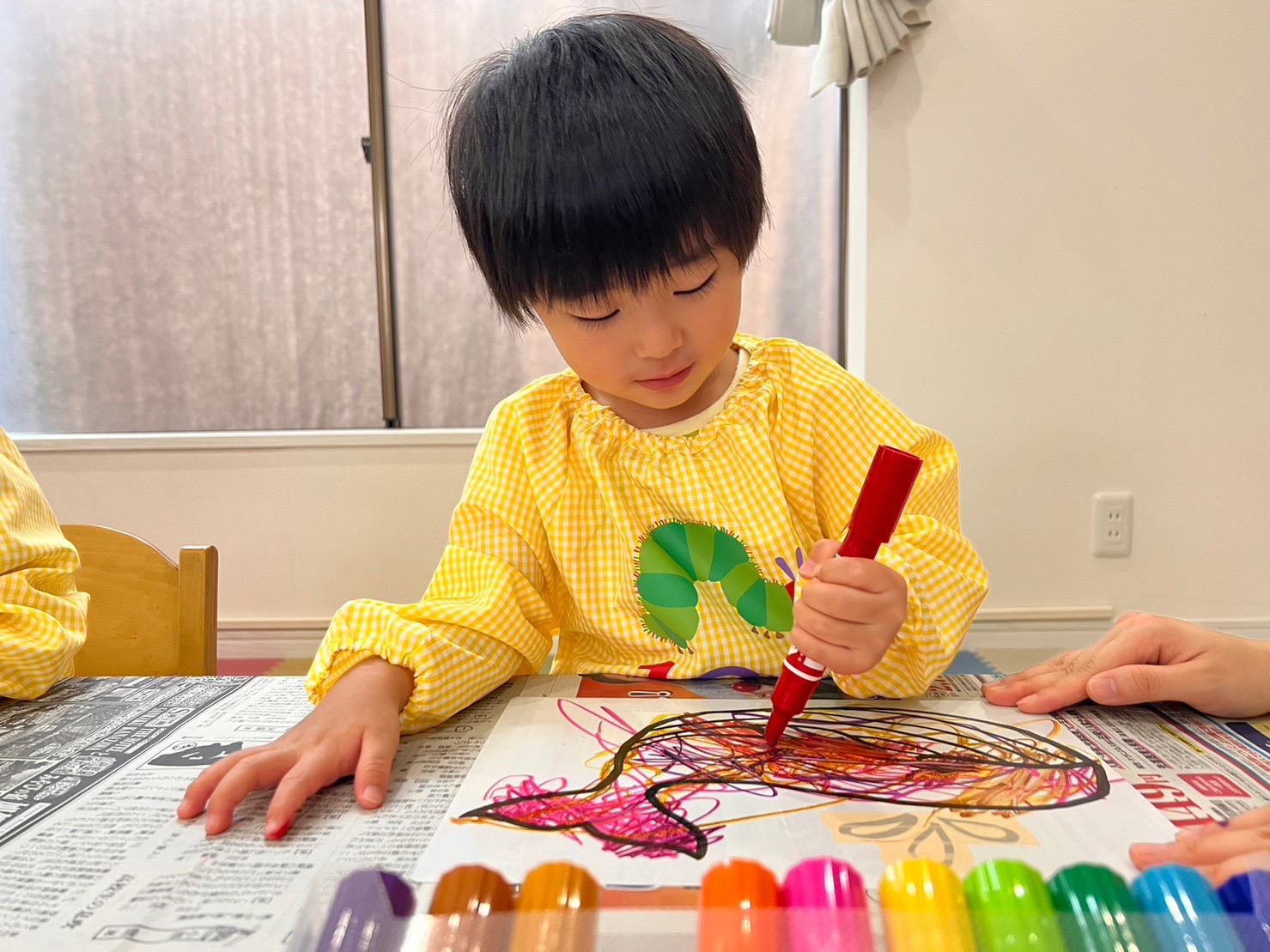 好きな色のマジックペンを選び、上手にペン持ちをして描いていく子どもたち✍️