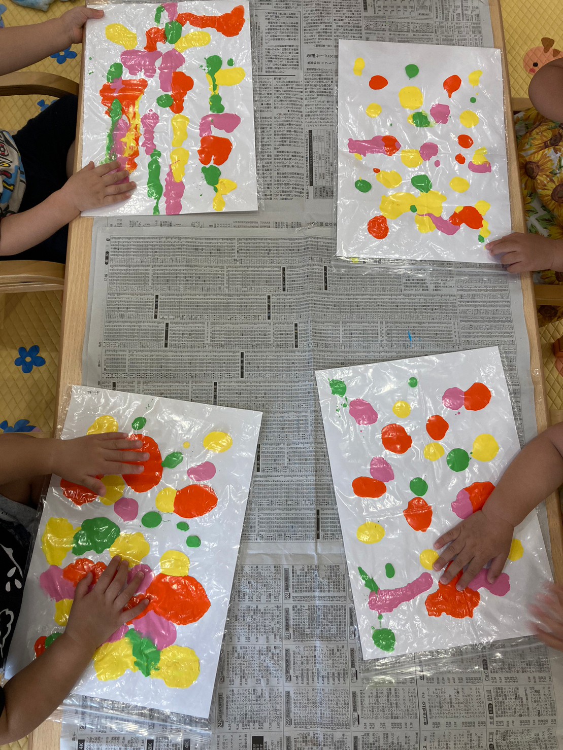 画用紙にいろんな色の絵の具を垂らして、袋の上からフィンガーペイントを楽しみました🎨