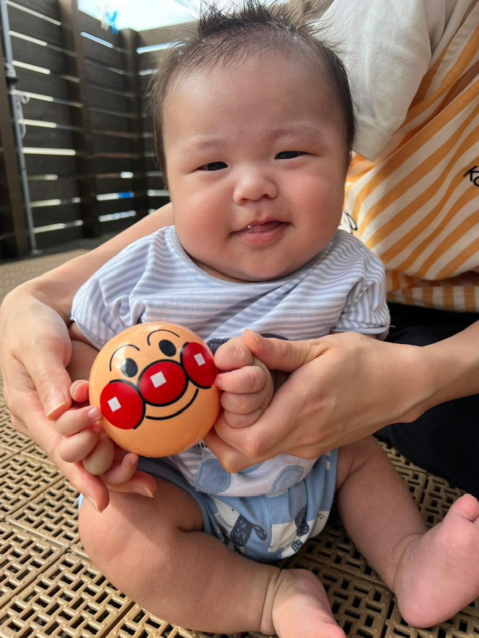 保育者と一緒にボールを持ちながら「見てみて、アンパンマンだよ」と教えてくれるように微笑み、感触を楽しんでいました💕
