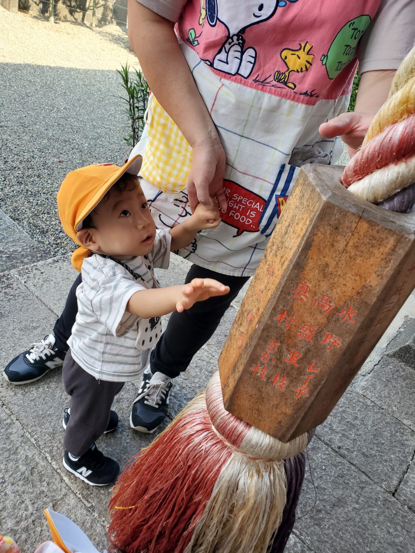 「大きいなー」と言うように眺めながら、保育者と一緒に鐘を鳴らしました🎵