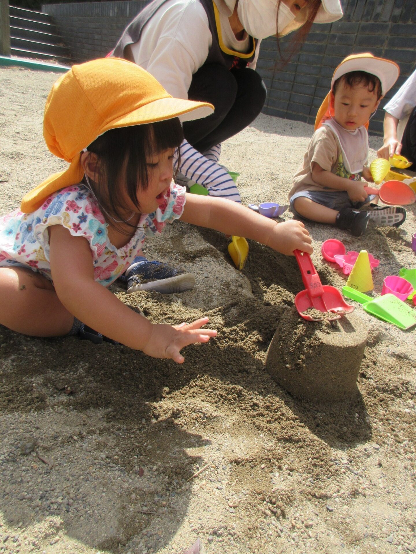 初めての砂遊びでは、保育者と一緒に砂を掘ったり、スコップで砂を掬ったり、手で触り、存分に砂の感触をあじわいました❗