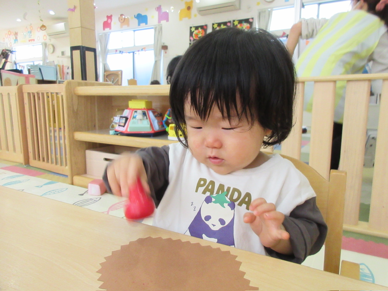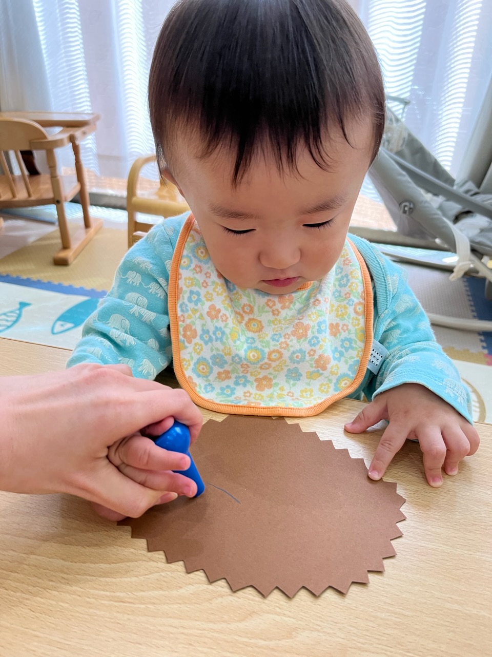 高月齢児は、以前からベビークレヨンを使ってお絵描きをしているので、今回はハリネズミにお絵描きをして模様を付けます♪