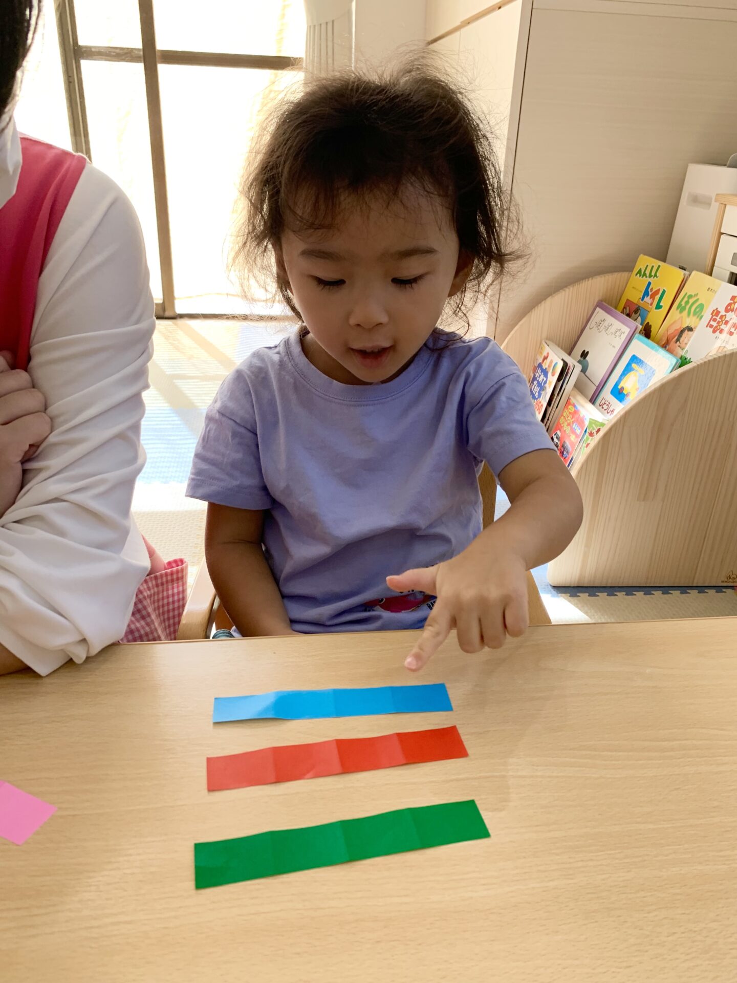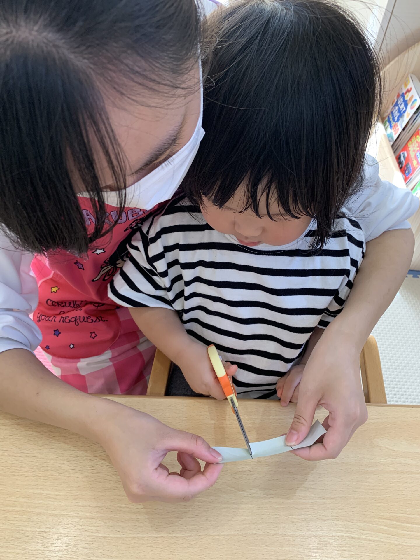 はじめは、保育者と一緒にハサミを持って、折り紙を切っていたのですが、今回は、慣れてくると一人でハサミをチョキチョキと動かして、折り紙を切ることができました🌟