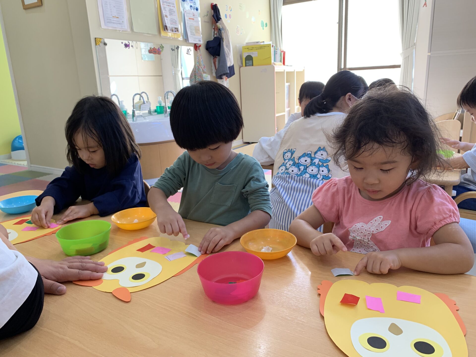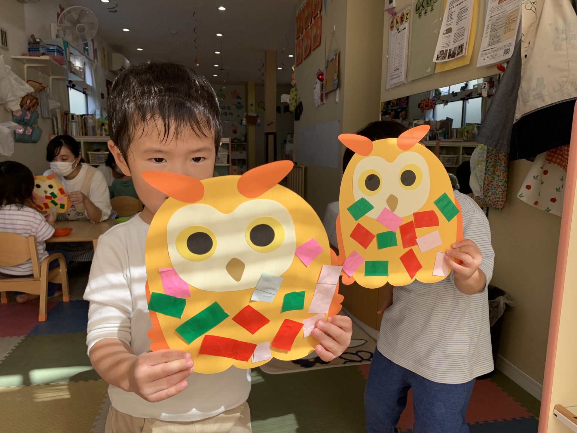 のりを塗った折り紙は、フクロウのお腹一面に重ならないように貼ったり、同じ色の折り紙を重ねて貼ったりして、様々な貼り方がありました🌟