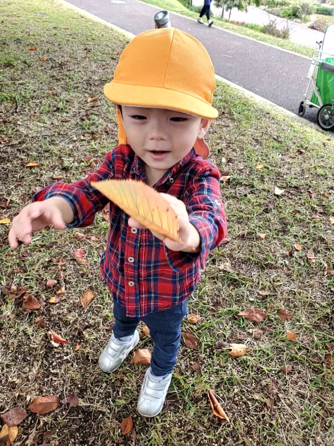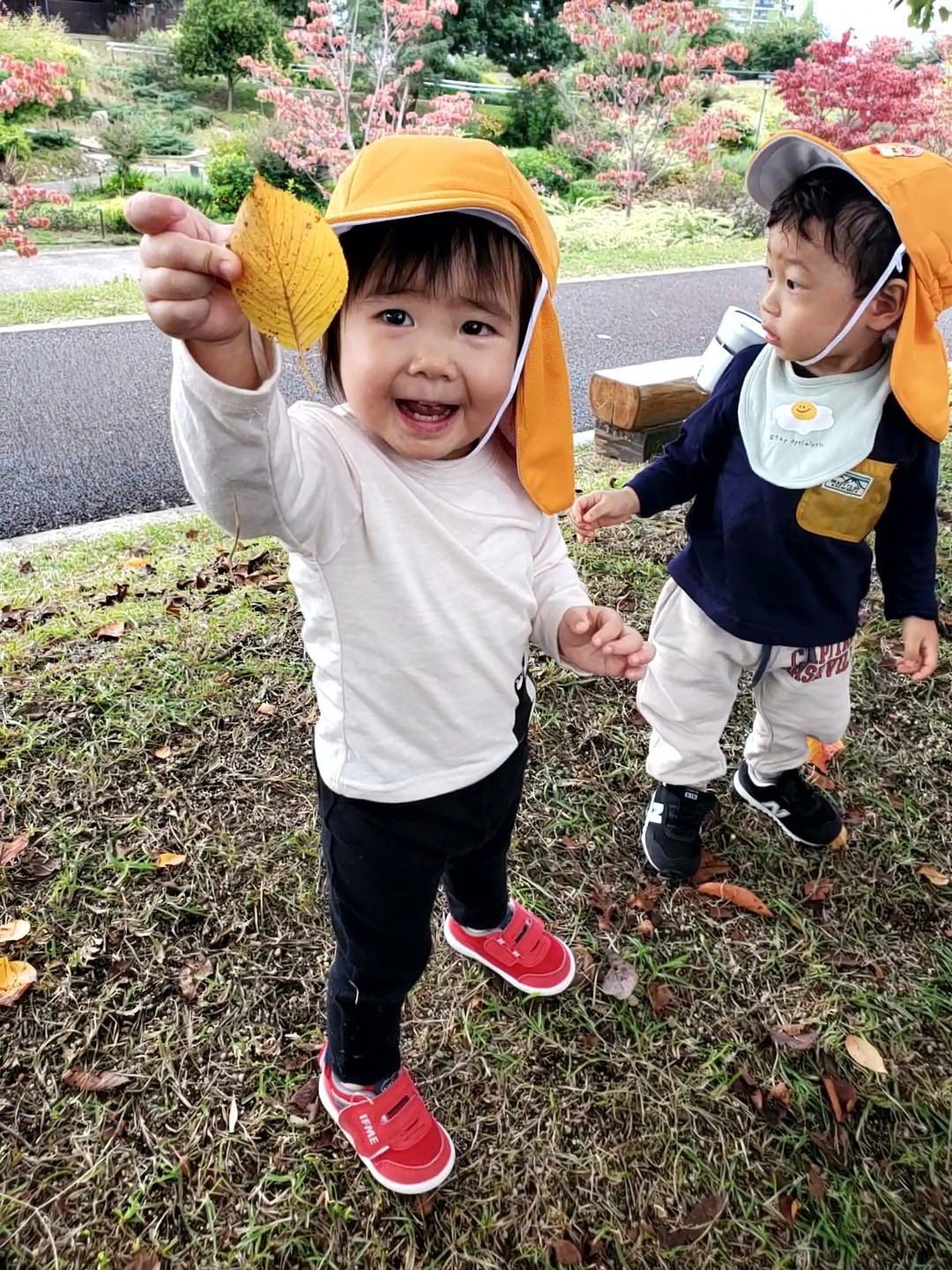 散歩時に、赤や黄色に色づいた落ち葉を、一生懸命拾ってくれた子どもたち🍂