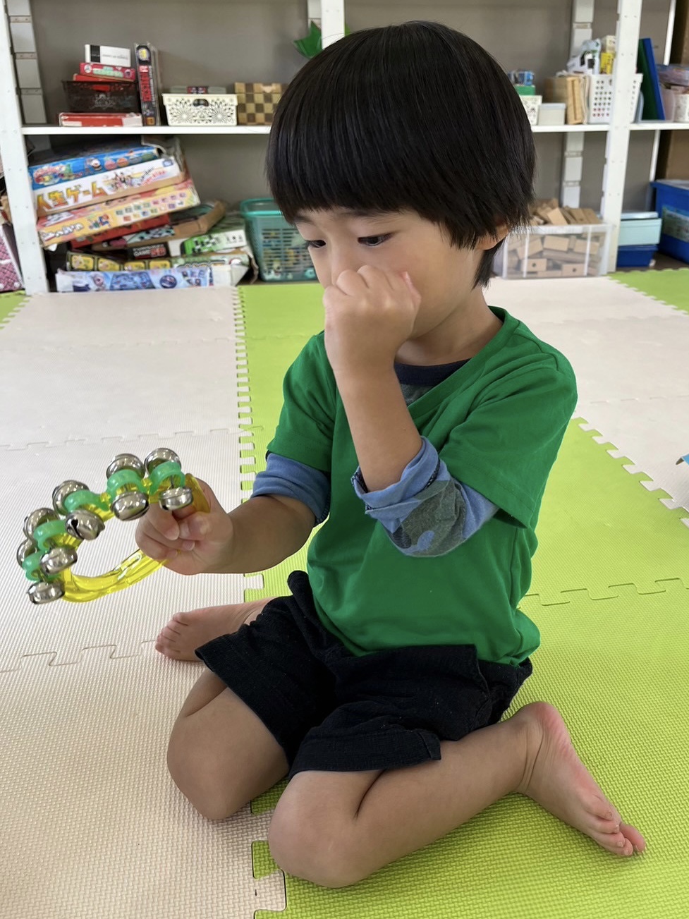 鈴でも、鈴を振って音を出したり、鈴を持っている方の手首を反対の手でトントンして音を出すなど、様々な鳴らし方を楽しむ子どもたちでした♬