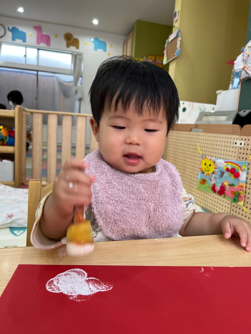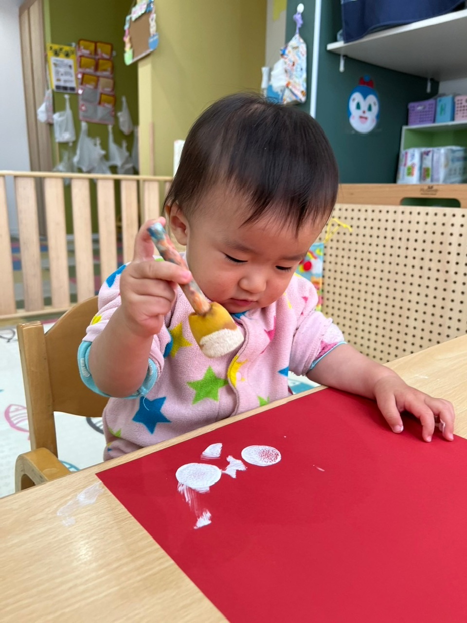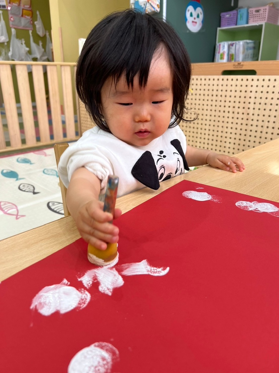 赤い画用紙に白い絵の具がつくと、「わぁ…!」と釘付けになる子どもたち✨