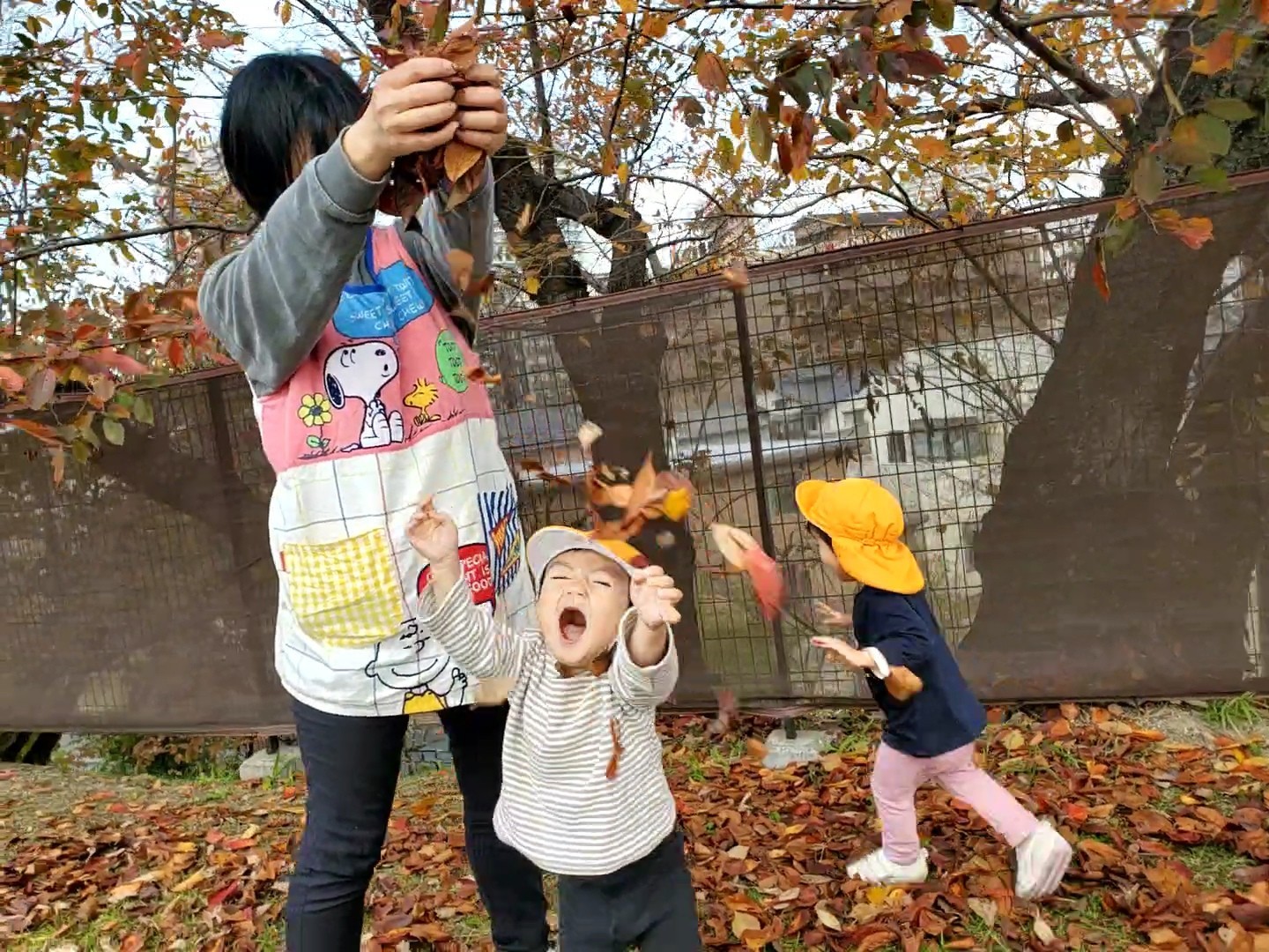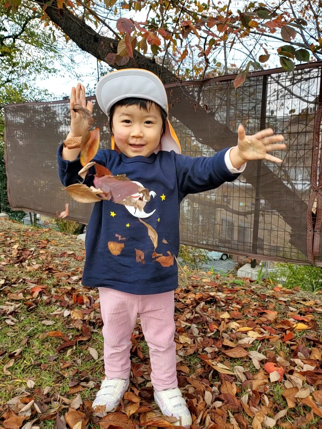 保育者が落ち葉を集めて、雪のように上から降らせると、両手を広げて大喜び❕