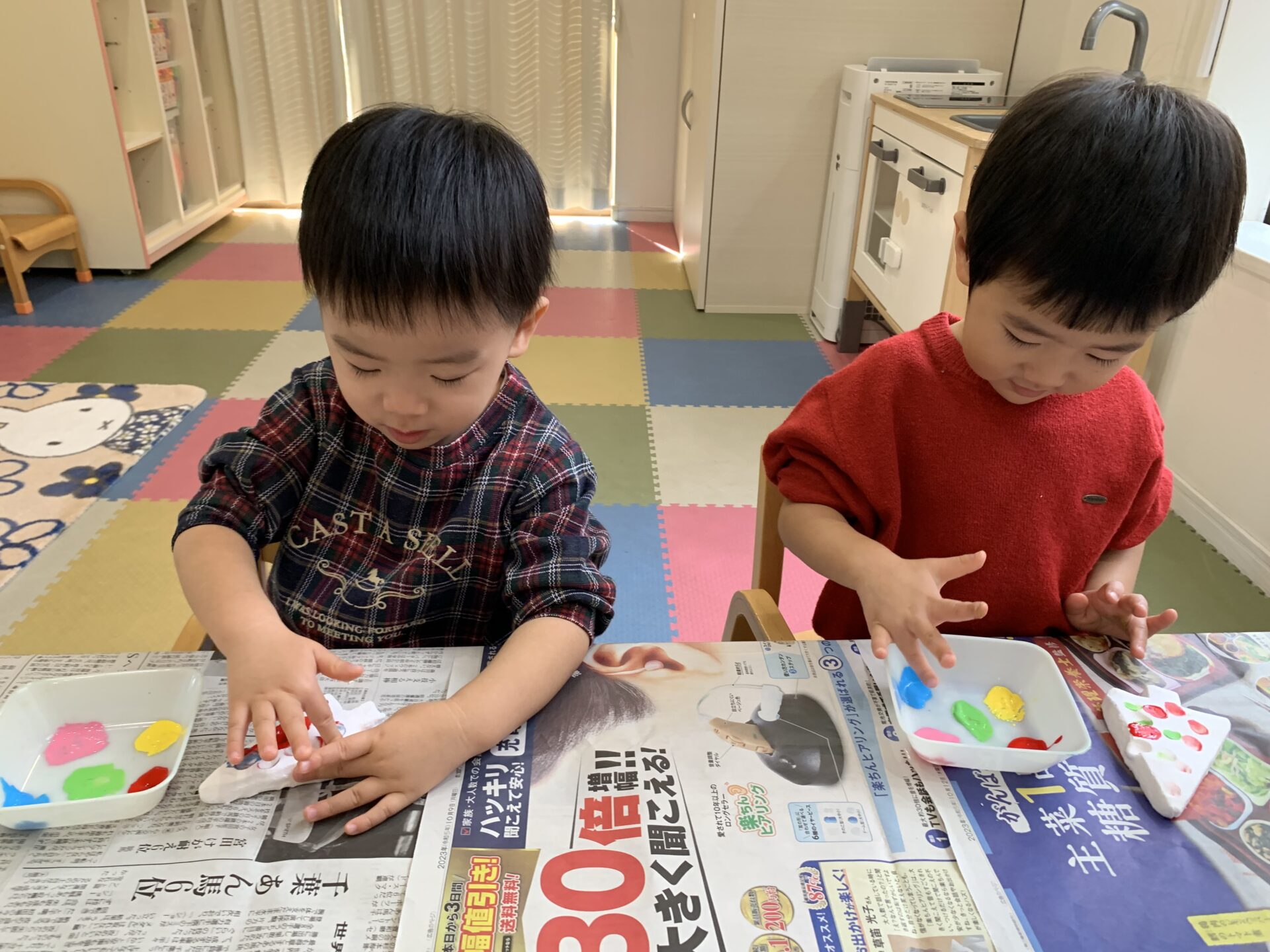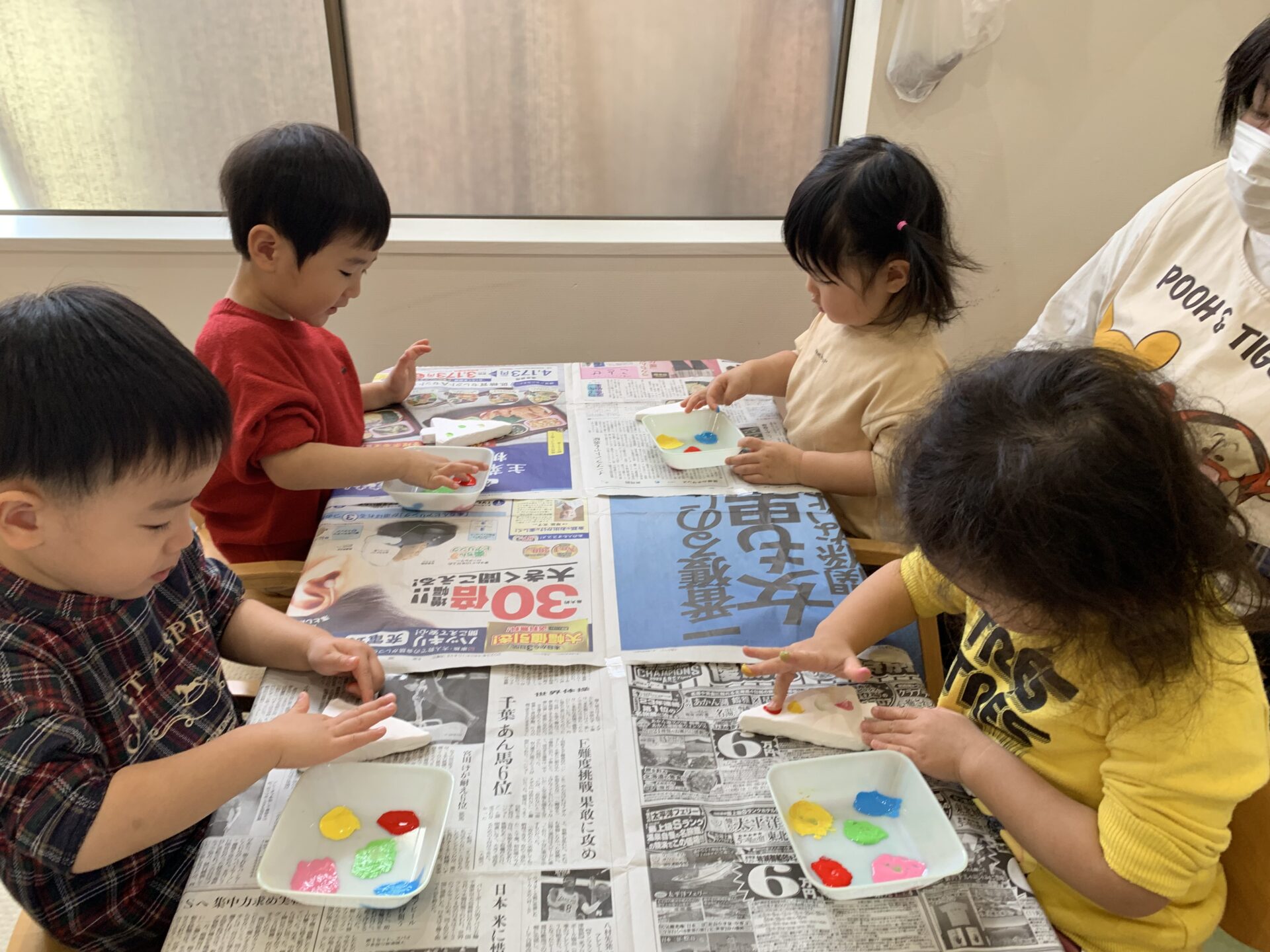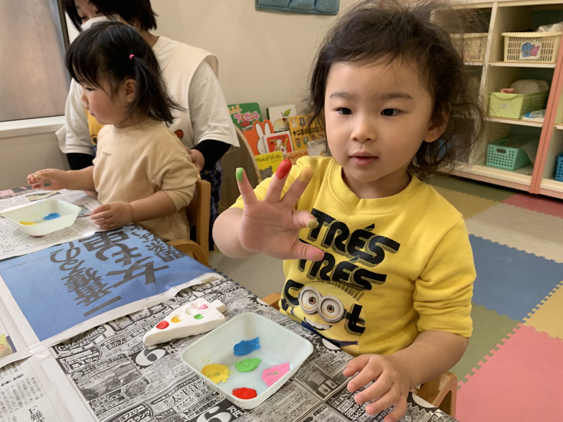 また、絵の具の色が混ざらないよう、絵の具をつける指をかえながら、スタンピングすることができました✨