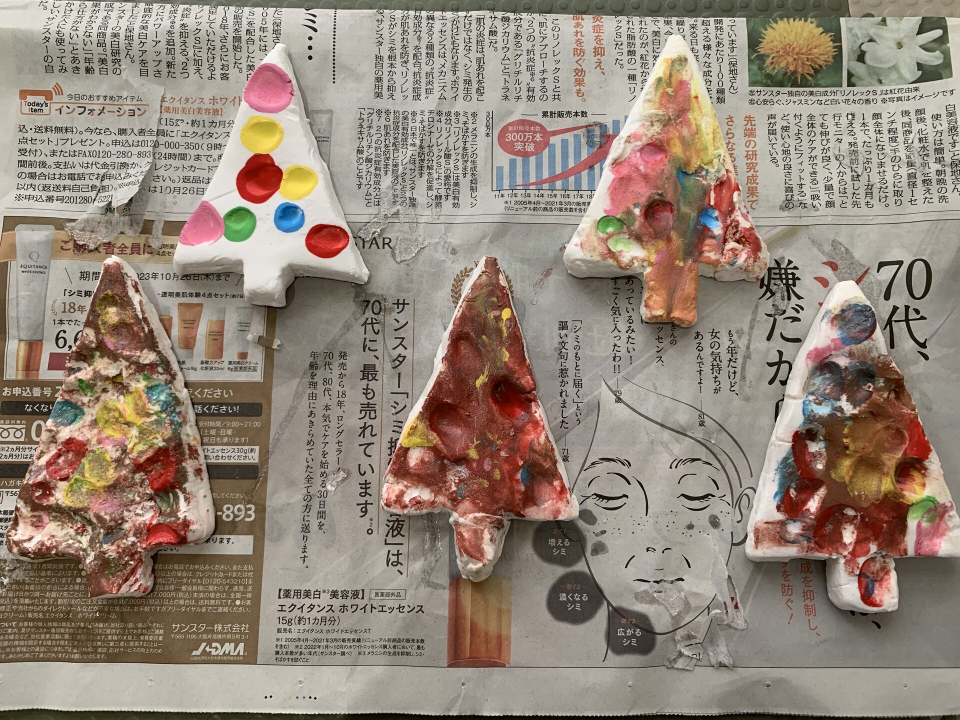 今回は、赤・ピンク・黄色・黄緑・水色の5色の絵の具を使って、ツリー型の紙粘土に指スタンプをしました🎨👆