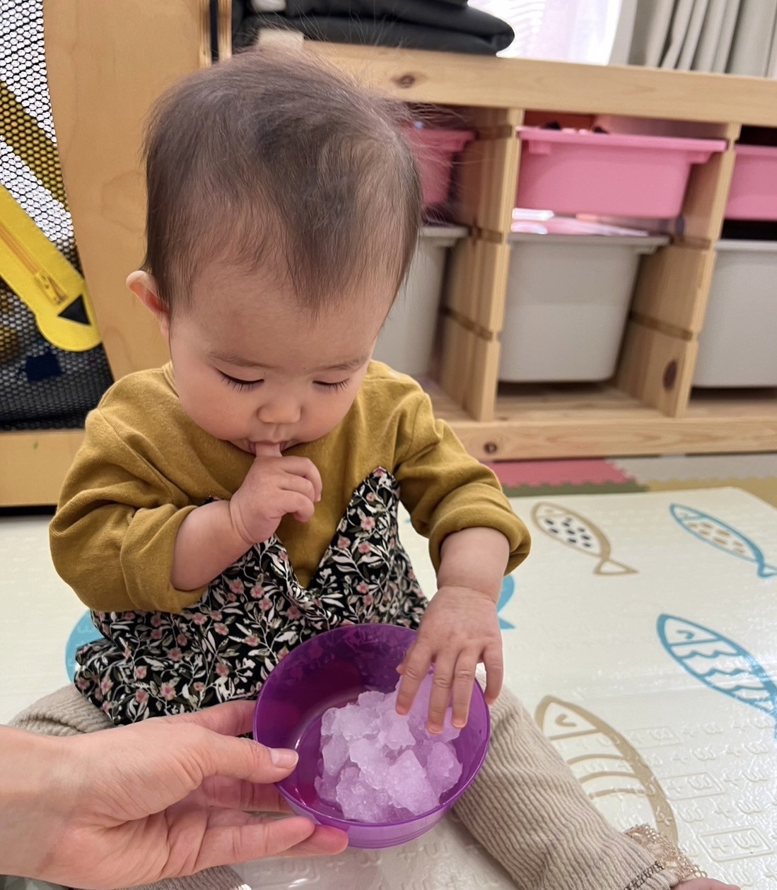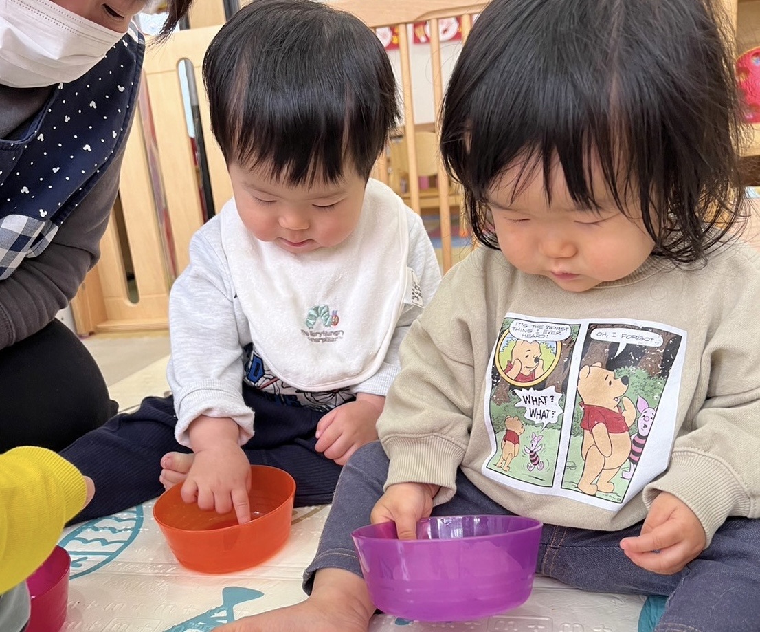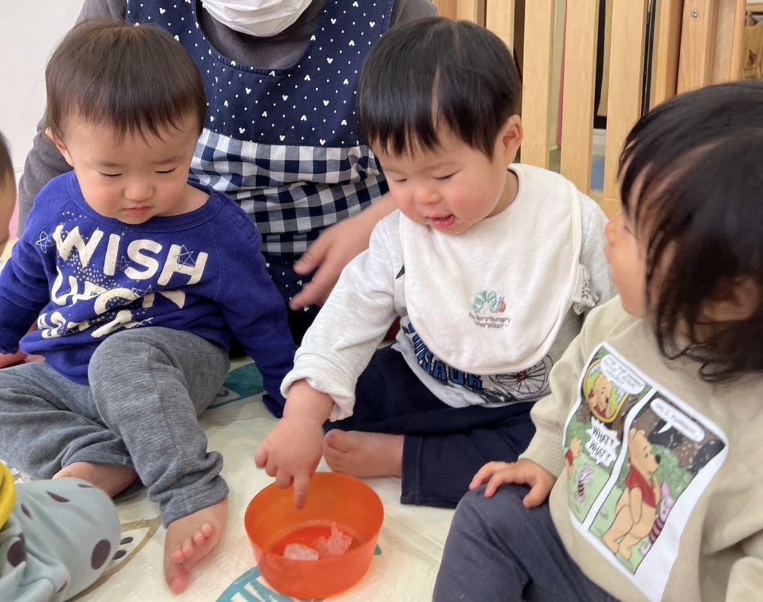 中には、美味しそうに感じたためか「あーん」とお口に入れようとしたり、保育者の手を引いて「一緒に触ろうよ🩵」とお誘いしてくれる子どももいました🤭