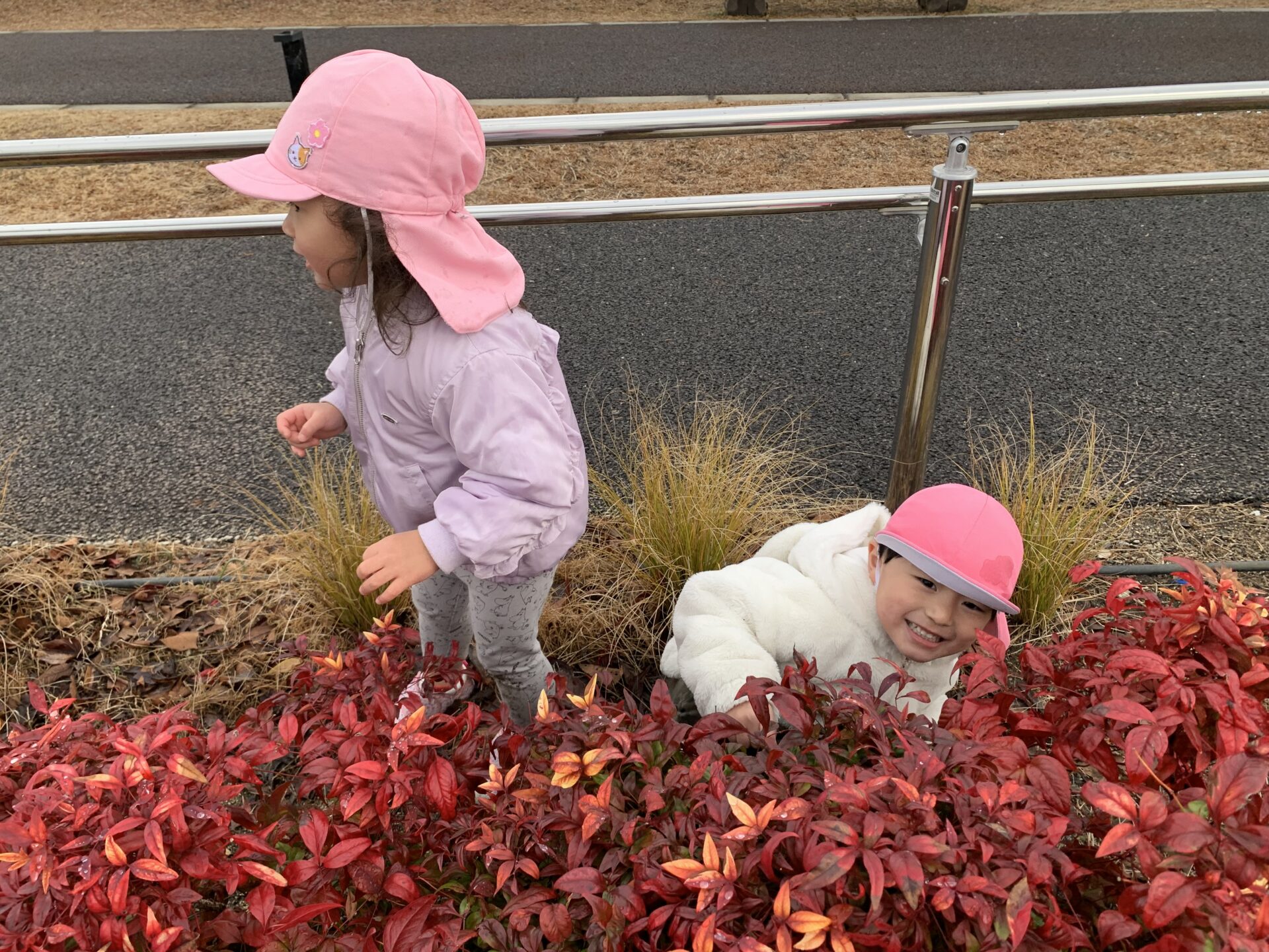 鬼役の保育者が10を数える間、できるだけ遠くまで走って逃げたり、お友だちと一緒に茂みに隠れていた子どもたち👀✨