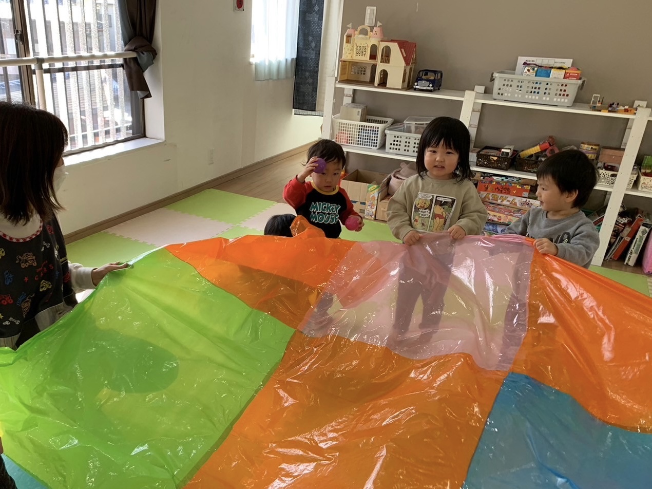 1月16日(火)は、いるか組(1歳児)のお友だちと一緒に、学童のお部屋を借りてパラバルーンあそびをしました‼️