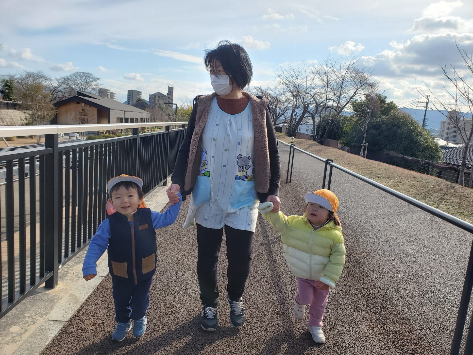 de愛ひろばからは、バギーから降りて、保育者やお友だちと手を繋いで歩きました