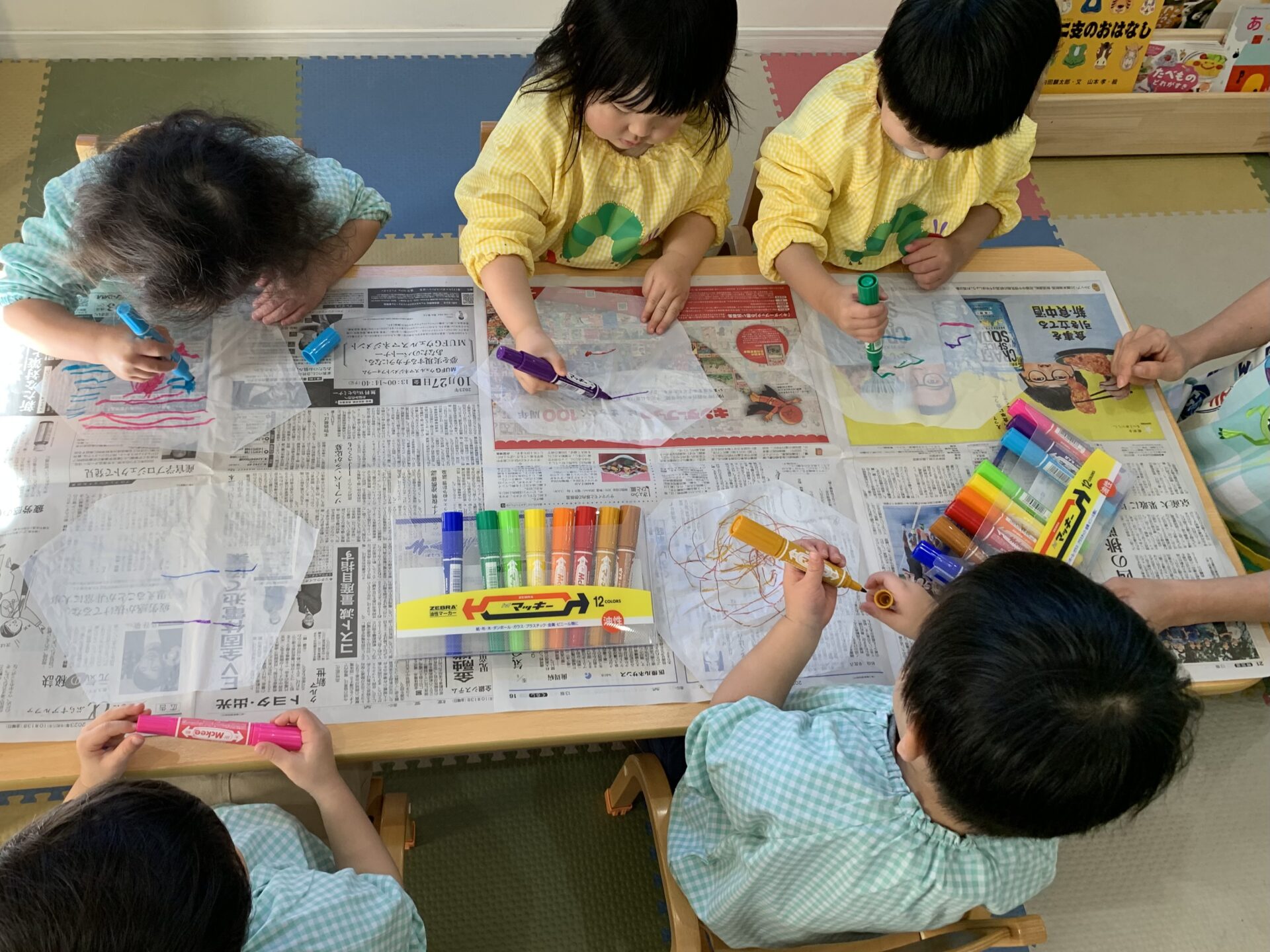 広場では、先週に油性マジックペンでお絵描きをしたり、スズランテープで凧の足をつけたりした手作り凧を使って、凧揚げを楽しみました🪁