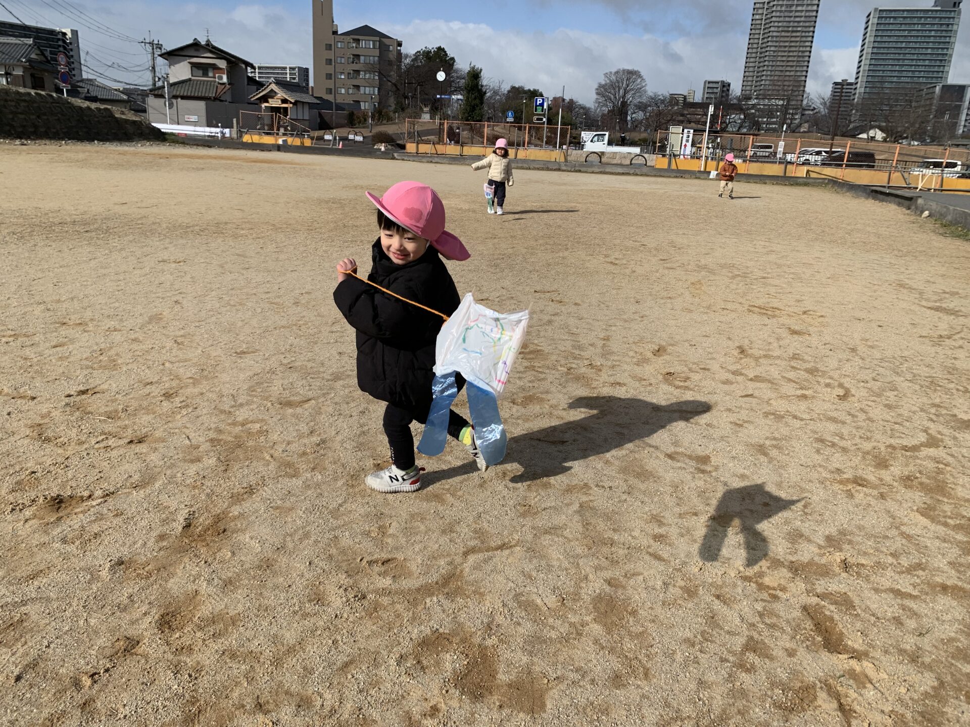 また、凧揚げをした後もお友だちや保育者と一緒に走ったり、地面にお絵描きをしたりして、少し寒い戸外でも元気いっぱいに遊ぶ子どもたちでした✨