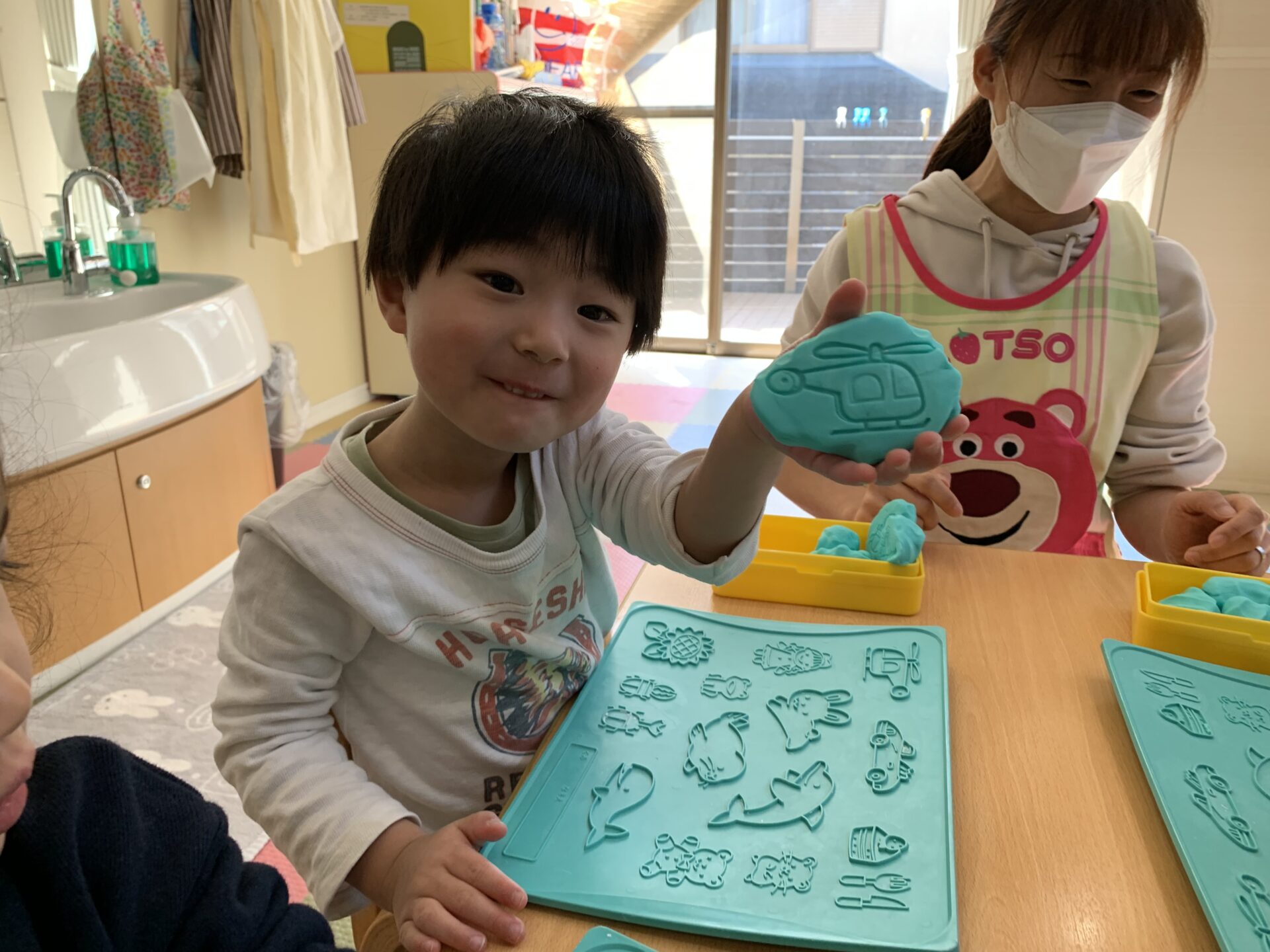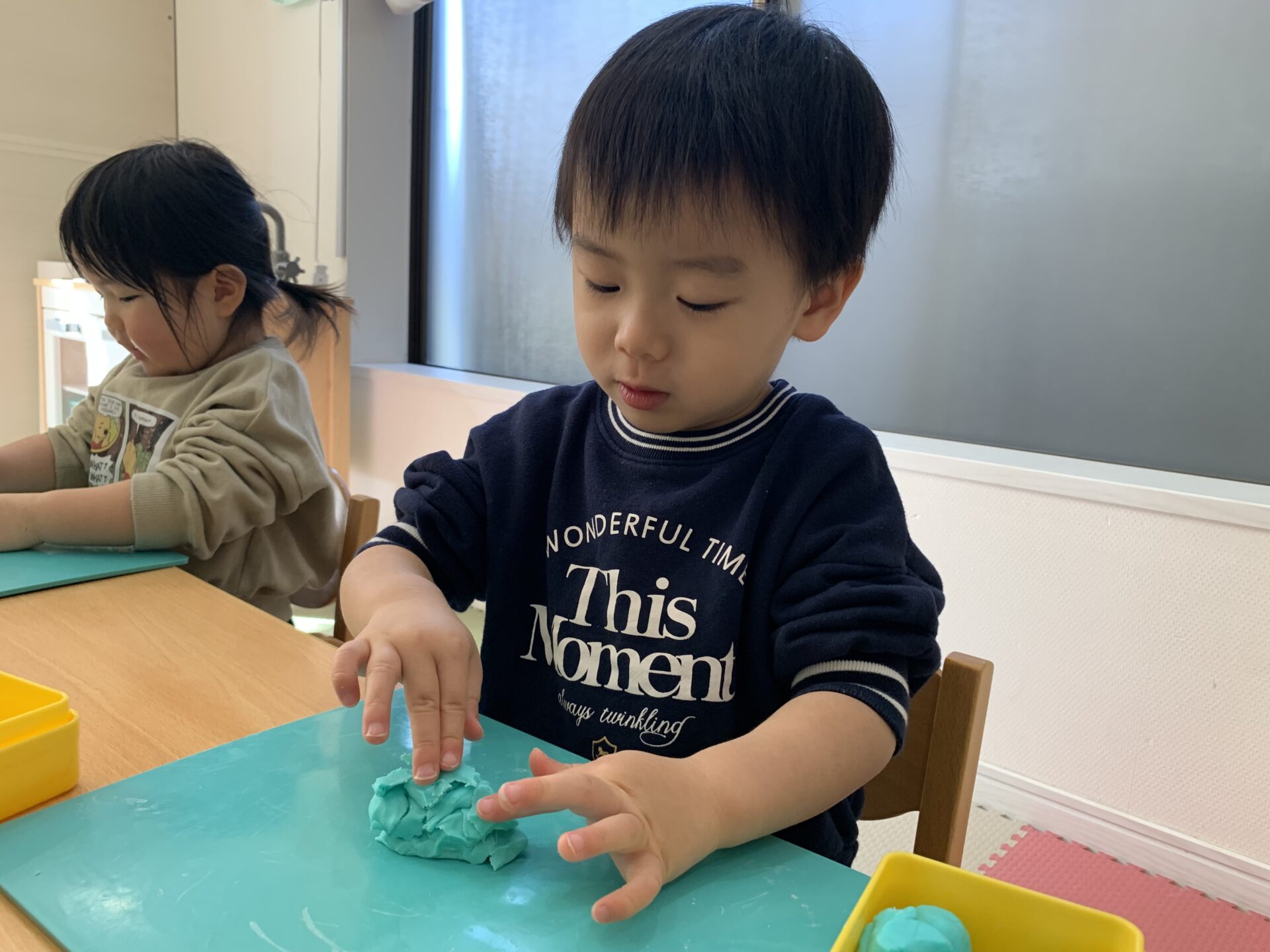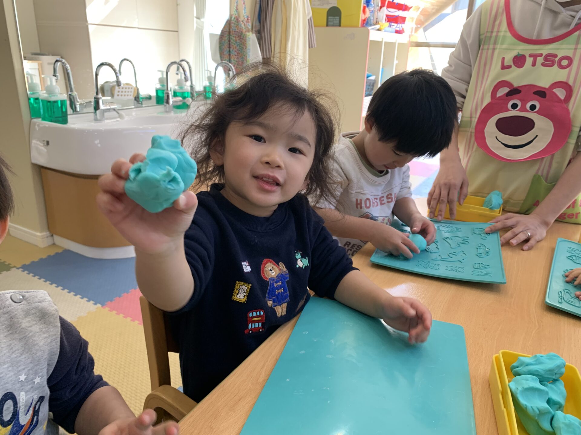 くじら組になってから、みんなで粘土あそびをするのは初めてでしたが、いるか組の時にしていたり、12月に粘土を使ったクリスマスツリーのオーナメントづくりをしていたこともあり、保育者が粘土あそびの用意をしている時から「粘土あそびするの?」と、目を輝かせて楽しみしていた子どもたち👀✨