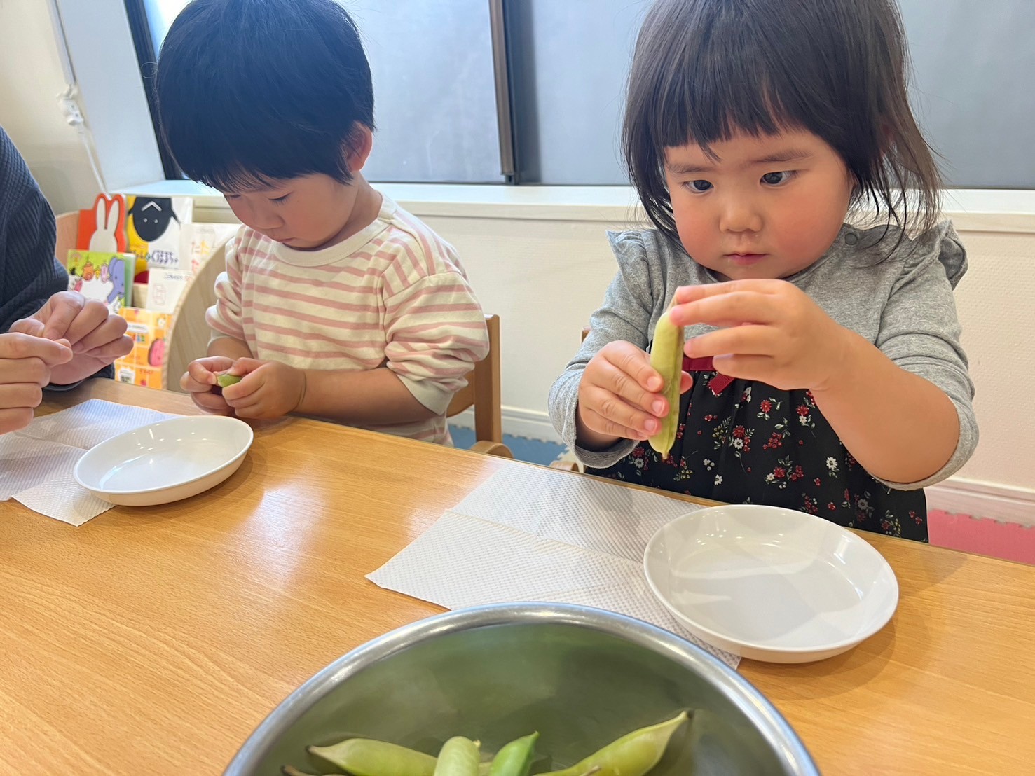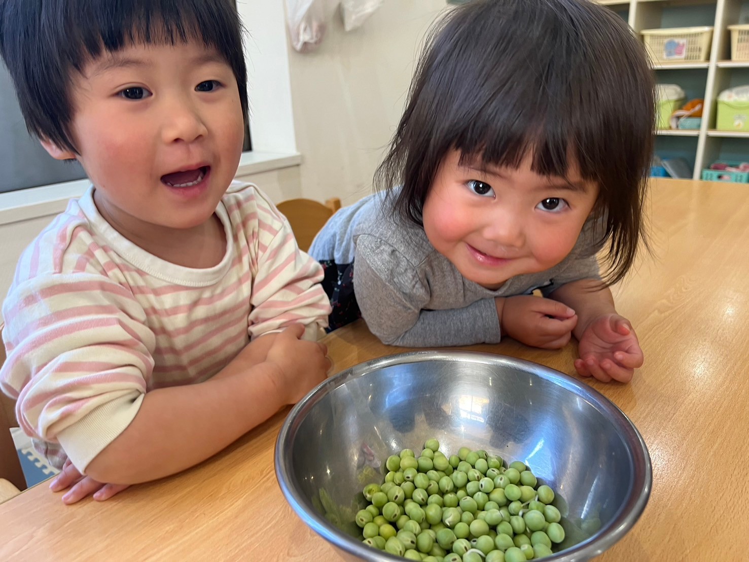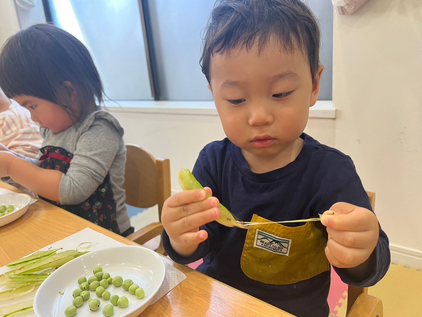 5月9日は、食育体験としてえんどう豆の皮むきをしました。