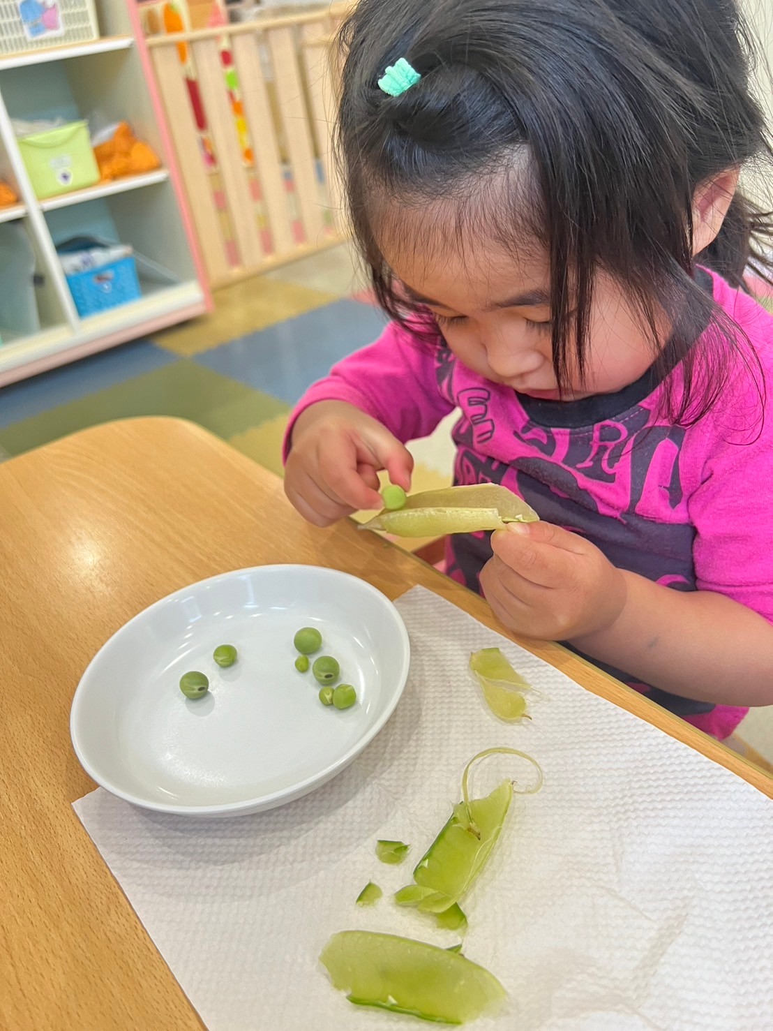 保育者がむき方を説明し、筋に少しだけ切り込みを入れてあげると、慣れた手付きでスーッと筋を引っ張ることができました✨️