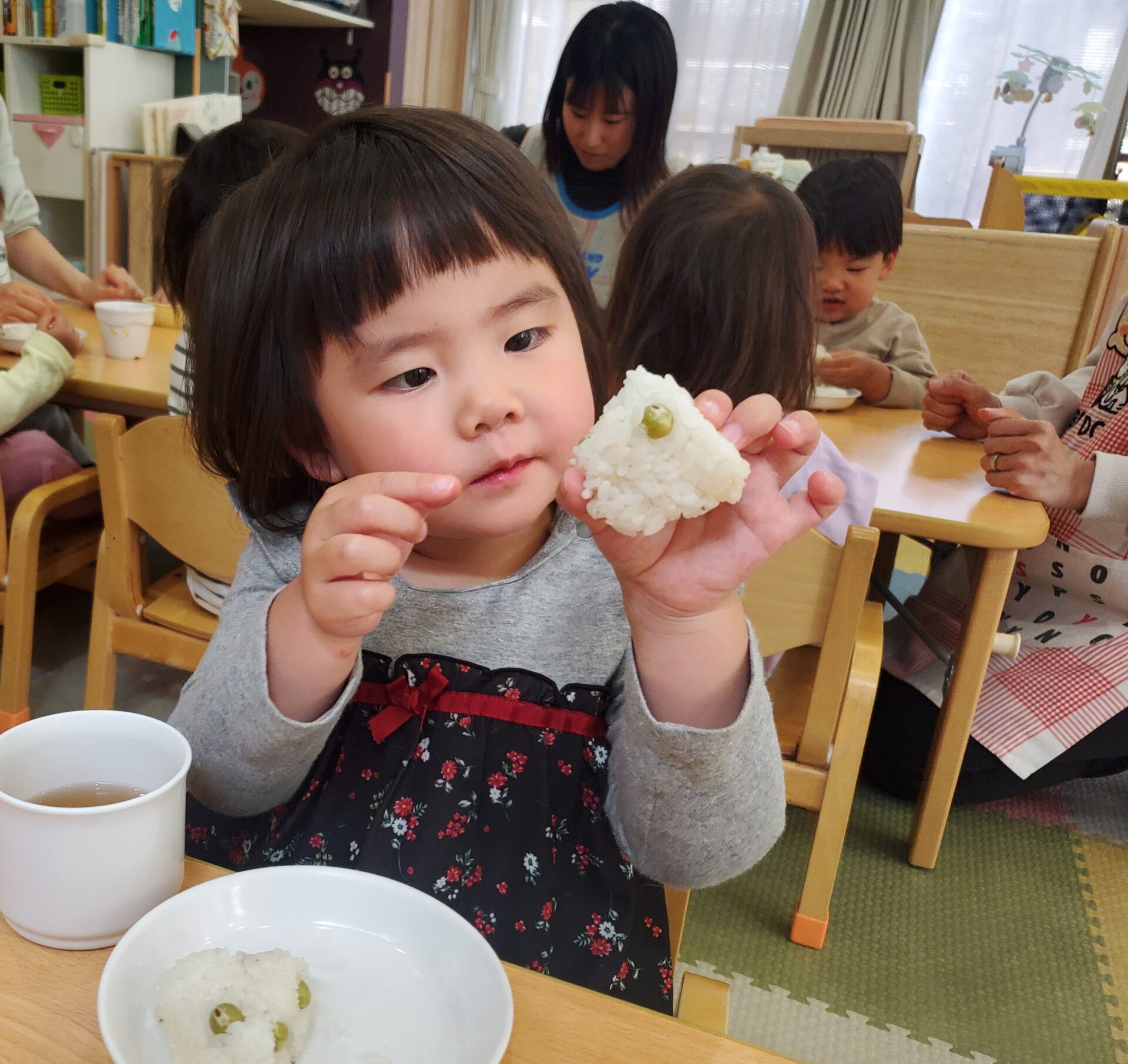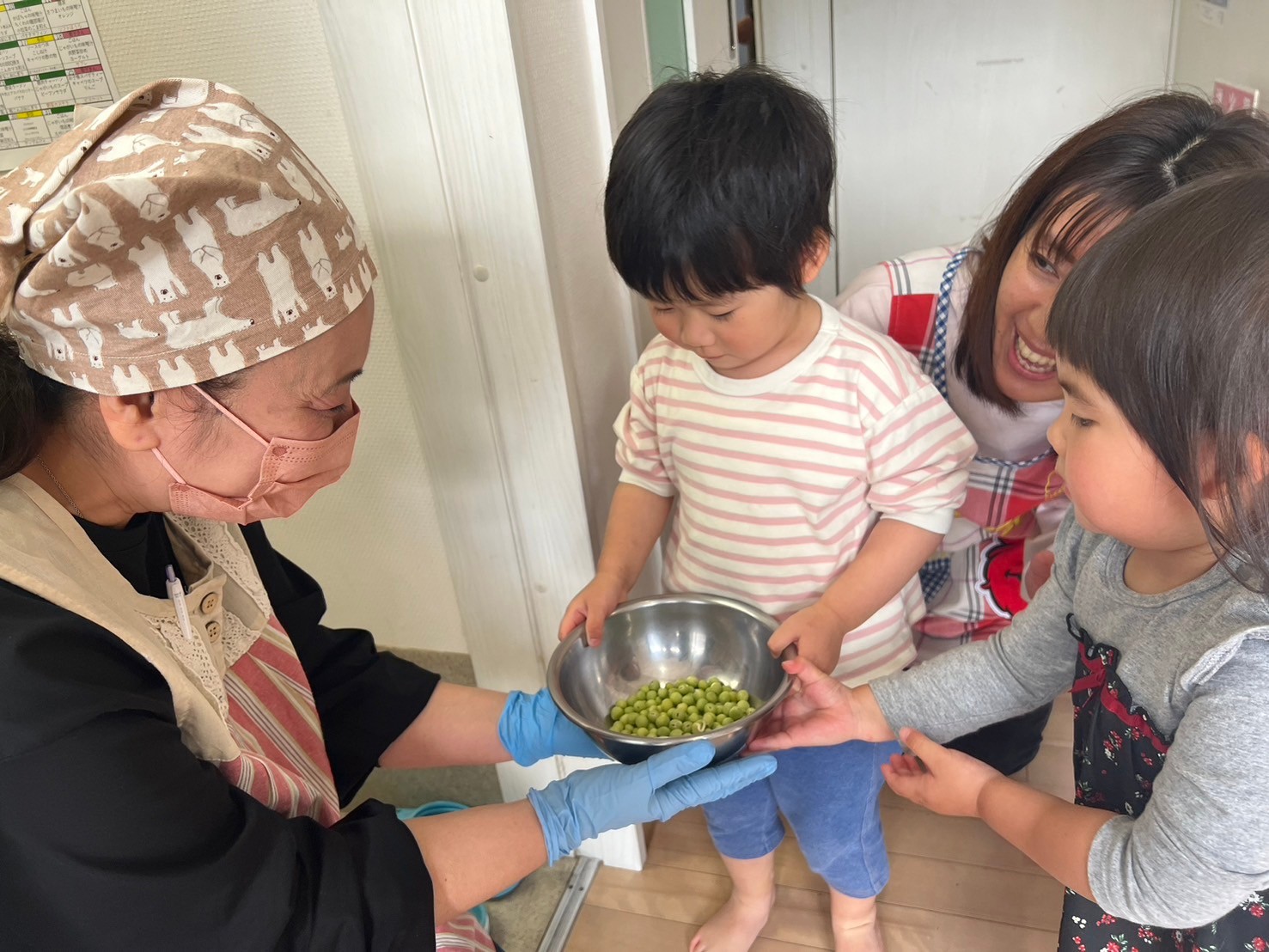 みんなが頑張ってむいてくれたお豆は、午後のおやつの豆ご飯おにぎりになります🍙