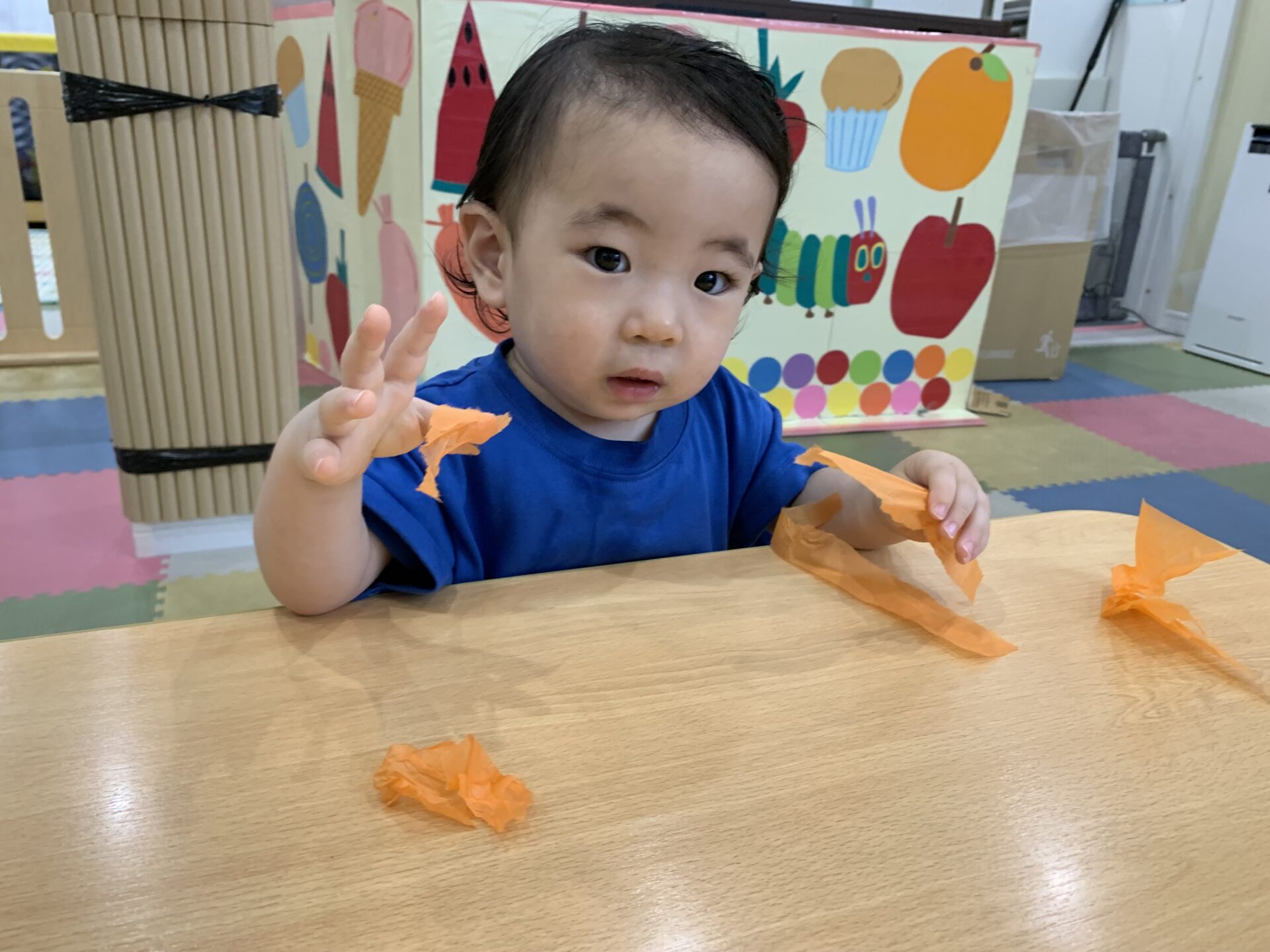 最近した新聞紙遊びの中でも、指先を使いながらちぎって遊んだこともあり、ちぎることを楽しんでいた子どもたちです♪