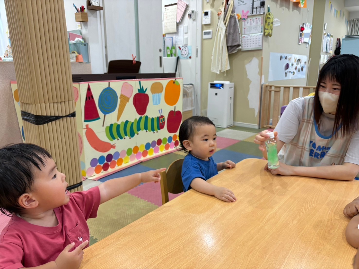 保育者が見本を見せると、センサリーボトルに興味津々な子どもたち👀✨