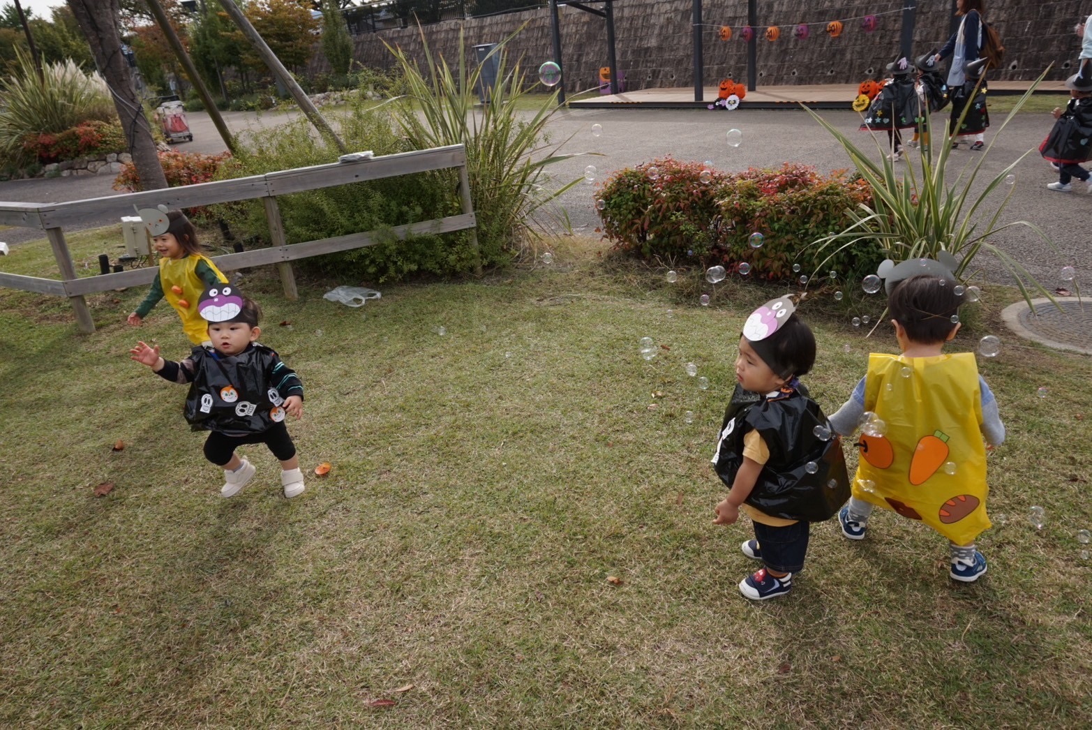 de愛ひろばでは、カボチャお化けのお口にボールを入れるゲームや、シャボン玉、色メガネを楽しみました😊
