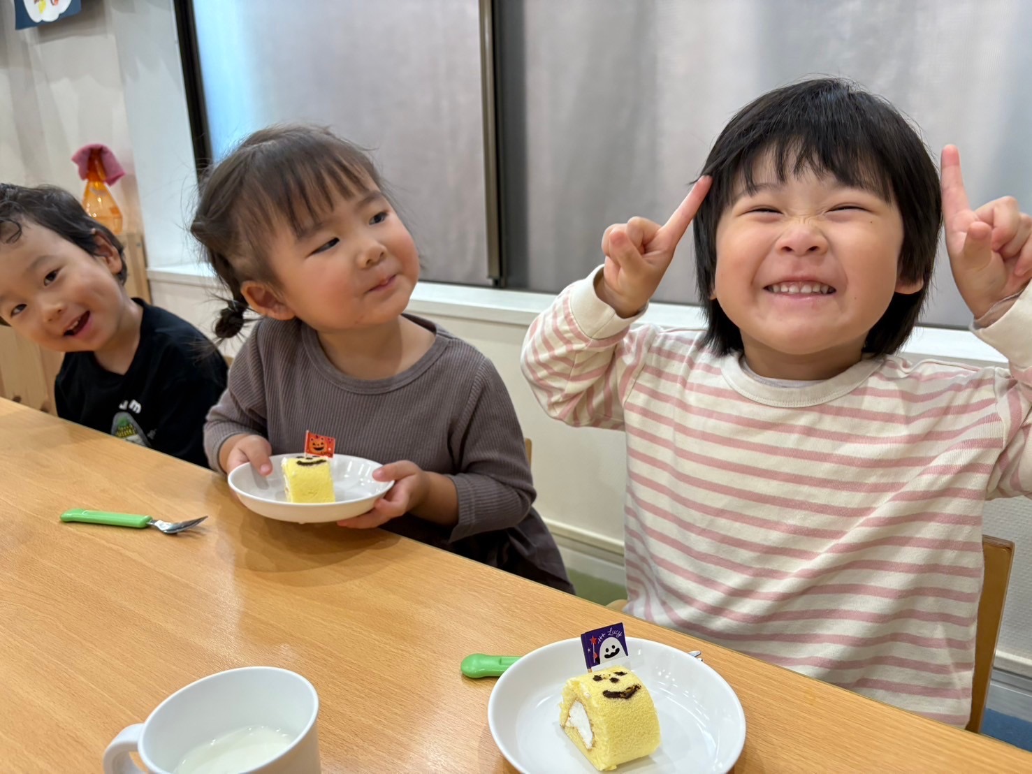 お楽しみはまだまだ続き、午後のおやつではミニロールケーキを食べ、降園時にはお菓子のお土産も貰いました❤️