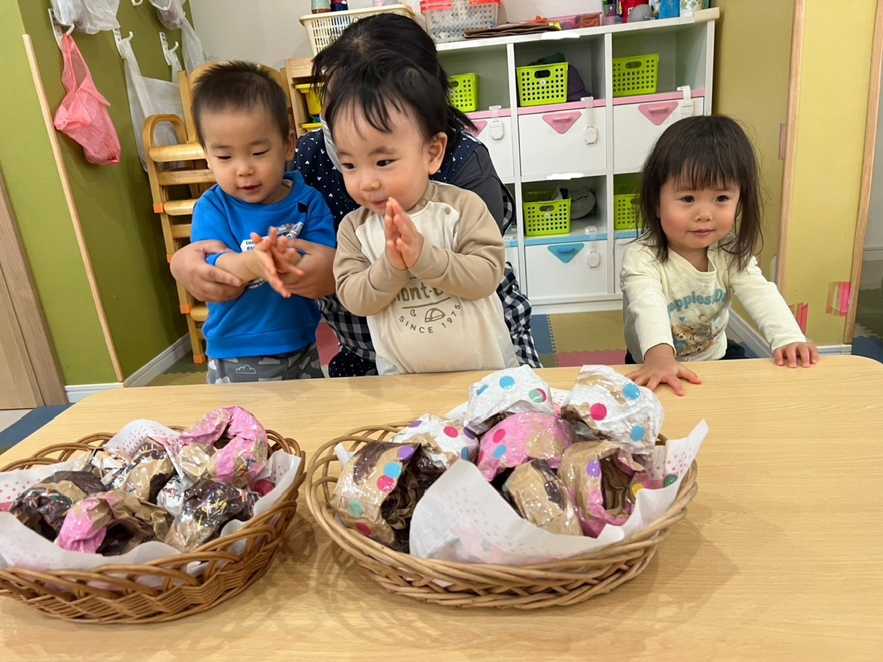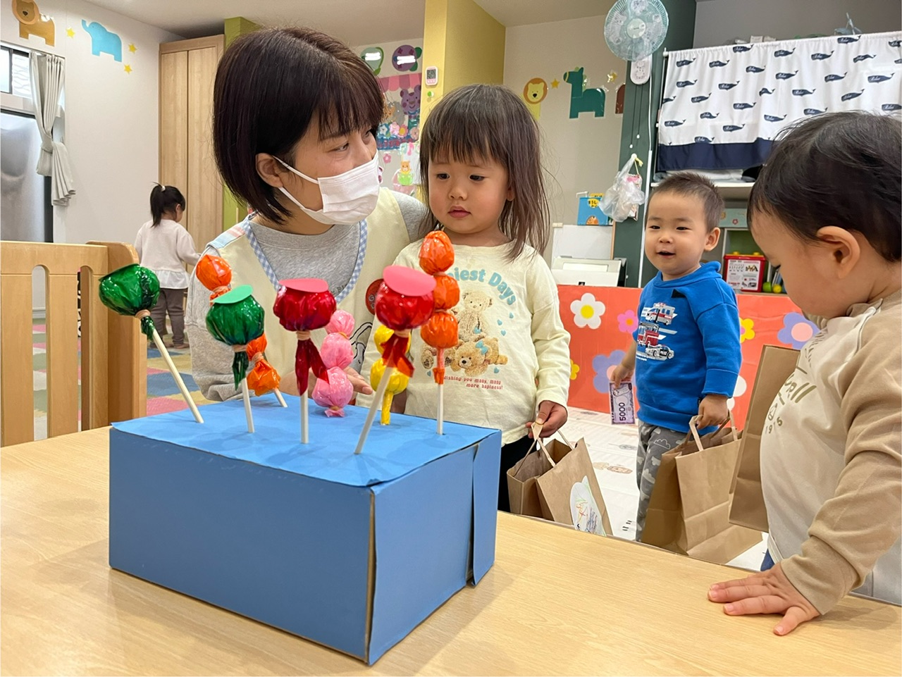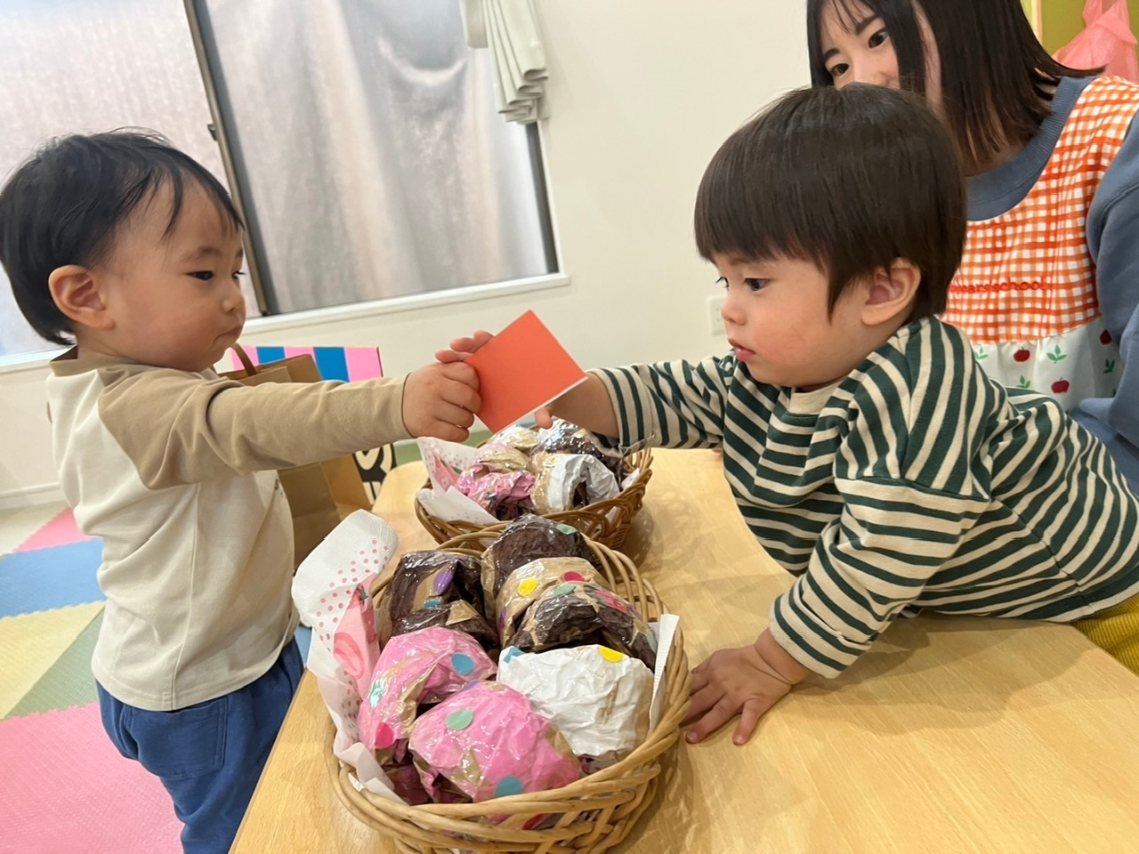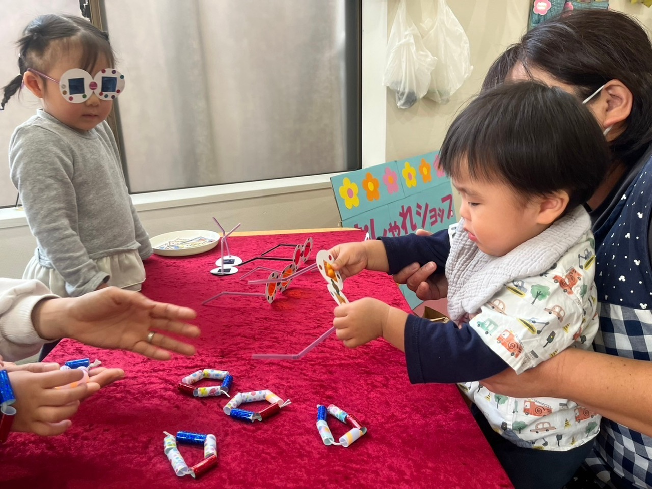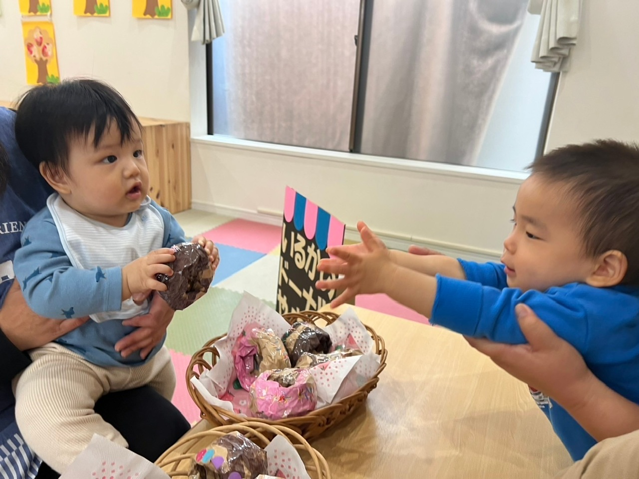 1歳児、0歳児クラスの子どもたちは、保育者と一緒にお店屋さんならではのやりとりを行い、楽しむことができました💕