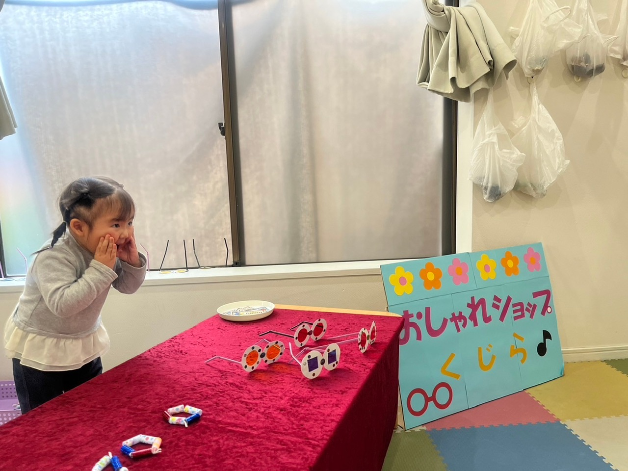 くじら組(2歳児)は、メガネとブレスレットを販売する『おしゃれショップくじら』です!