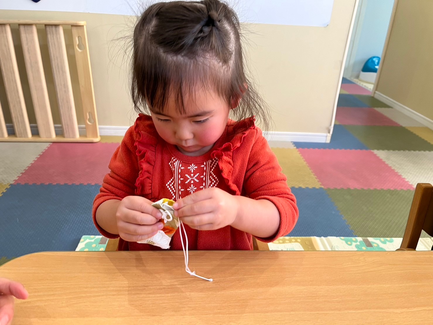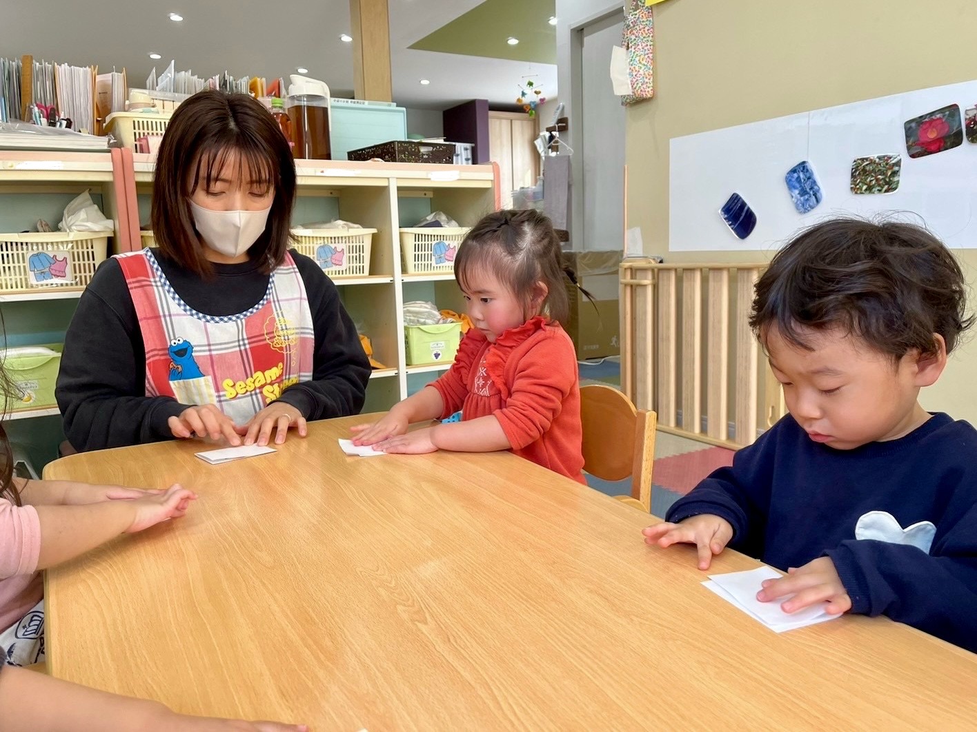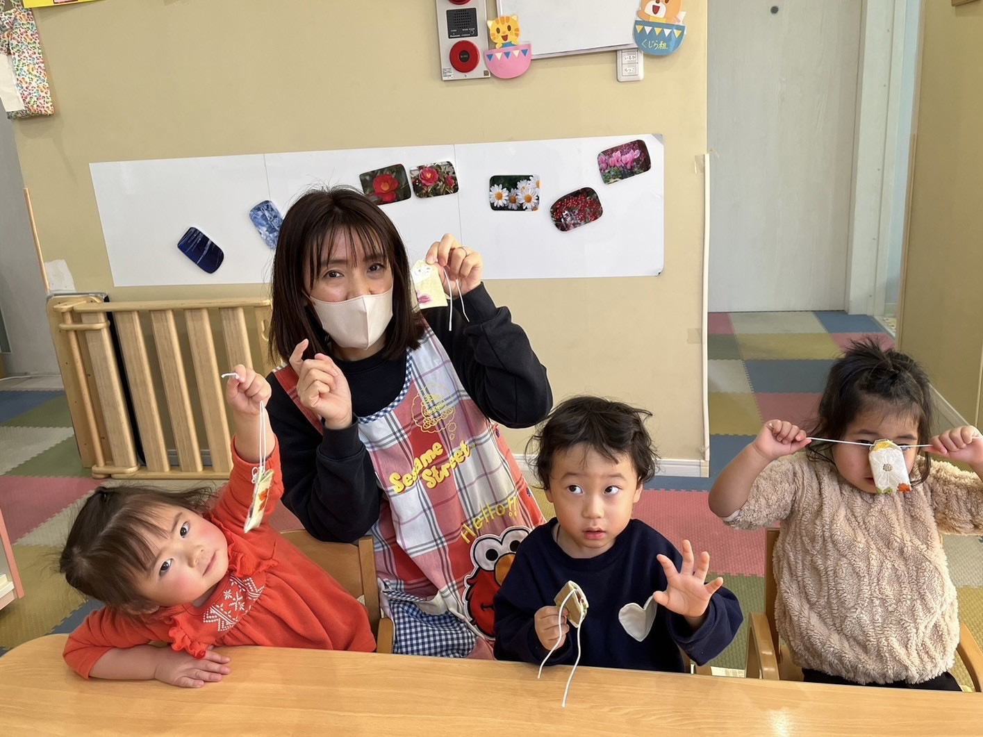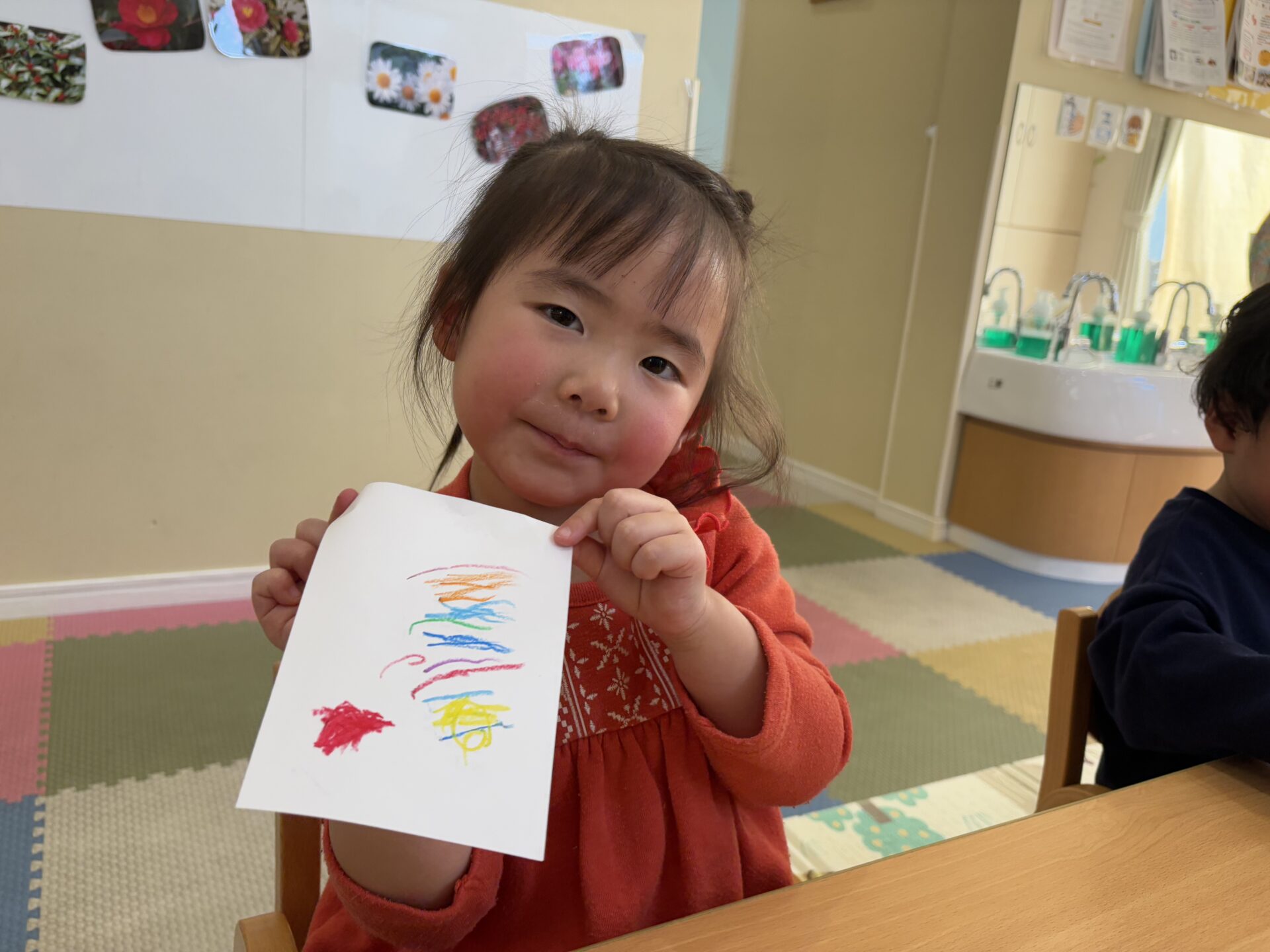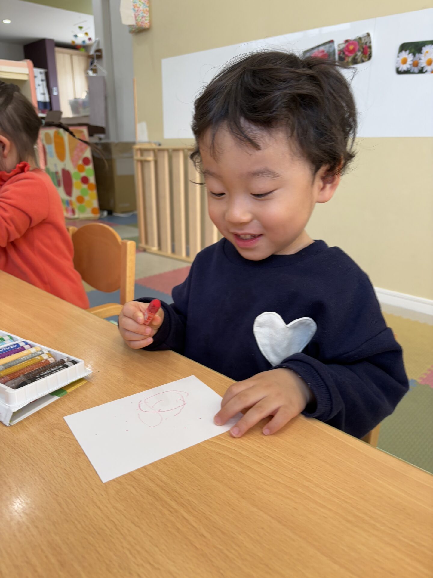 字を書くことはまだ難しい2歳児クラスの子どもたちには、お守りの中に入れる紙に、好きな物や好きな人の絵を描いてもらいました🖍️